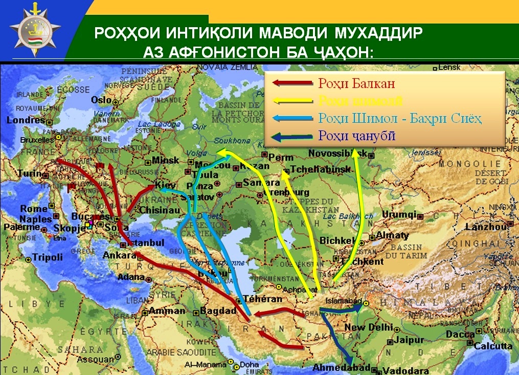 , сардори шуъбаи иттилоотӣ-таҳлилии Агентии назорати маводи нашъаовари назди Президенти ҶТ мегӯяд, имрӯзҳо се хатсайри асосии интиқоли маводи мухаддир аз Афғонистон ба кишварҳои минтақа вуҷуд дорад. Вай афзуд: “Хатсайри аввал Балкан ном гирифта, аз ҳудуди Эрон, Покистон, Туркия ва кишварҳои нимҷазираи Балкан убур мекунад ва ба бозори Аврупои шарқӣ ва ғарбӣ роҳ меёбад. Роҳи дигар хатсайри ҷанубӣ мебошад, ки тавассути он маводи мухаддир ба Покистон ва сипас ба дигар кишварҳои Осиёи ҷанубу шарқӣ ва Чин мерасад. Ва ниҳоят хатсайри шимолӣ, ки аз тариқи он маводи мухаддир ба кишварҳои Осиёи Марказӣ ва сипас ба Федератсияи Русия ворид мешавад”.