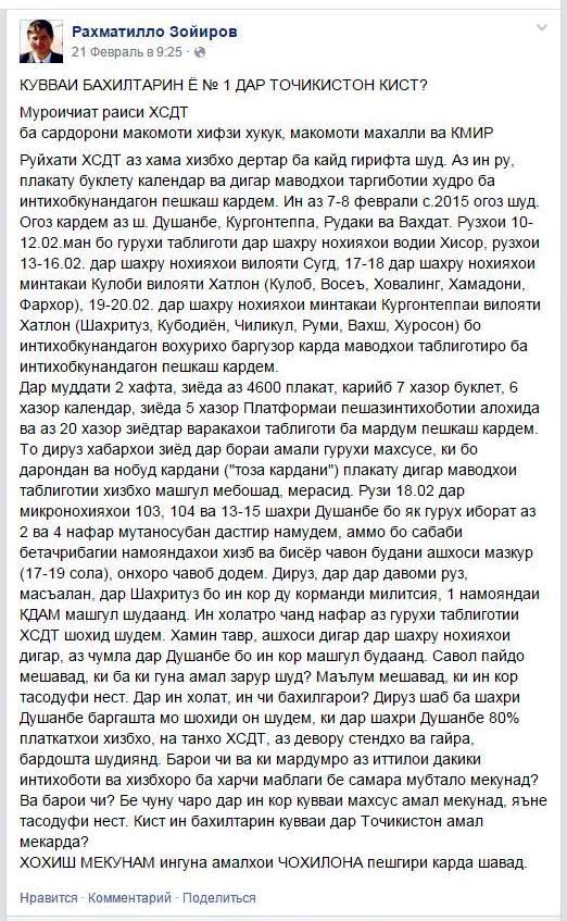 Раҳматилло Зоиров рӯзи 21-уми феврал низ бо интишори як муроҷиатнома таҳти унвони “Қувваи бахилтарин ё №1 дар Тоҷикистон кист?” ба сардорони мақомоти ҳифзи ҳуқуқ, мақомоти маҳаллӣ ва КМИР ҶТ аз дарондану нобуд кардани плакату дигар маводи таблиғотии ҳизбҳо хабар дод. Ба иддаои ӯ, дар ноҳияи Шаҳритус “бо ин кор ду корманди милитсия, 1 намояндаи КДАМ машғул шудаанд”. Вай дар идома навиштааст: “Савол пайдо мешавад, ки ба кӣ ин гуна амал зарур шуд? Маълум мешавад, ки ин кор тасодуфӣ нест. Дирӯз шаб ба шаҳри Душанбе баргашта, шоҳиди он шудем, ки дар шаҳри Душанбе 80% платкатҳои ҳизбҳо, на танҳо ҲСДТ, аз девору стендҳо ва ғайра бардошта шудаанд”. Зоиров дар идома пурсон шудааст: “Кӣ мардумро аз иттилои дақиқи интихоботӣ маҳрум ва ҳизбҳоро ба харҷи маблағи бе самара мубтало мекунад? Ва барои чӣ? Бе чуну чаро дар ин кор қувваи махсус амал мекунад, яъне тасодуфӣ нест”.