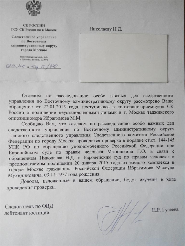 Ба қавли наздикони М.Иброҳимов эҳтимол меравад, ки сипас ӯ пинҳонӣ ба Тоҷикистон оварда шуда, танҳо баъд аз гузашти 10 рӯз мақомоти расмии кишвар тасдиқ намуданд, ки Иброҳимов дар Душанбе қарор дошта, дар тавқифгоҳи мувақкатии Кумитаи давлатии амнияти миллӣ нигаҳдорӣ мешавад.