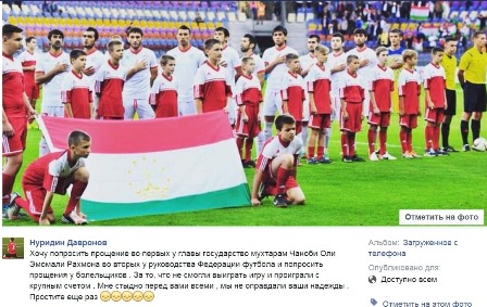 Нуриддин Давронов дар саҳифаи фейсбукиаш чунин навиштааст: «Мехоҳам узр бипурсам, аввал аз Ҷаноби Олӣ Эмомалӣ Раҳмон, дуюм аз раҳбарияти Федератсияи футбол ва аз мухлисон маъзарат мехоҳам. Барои ба пирӯзи ноил нагардидан дар бозӣ ва бохт бо ҳисоби калон. Ман аз он шармам меояд, ки ба умедҳои шумо ҷомаи амал пӯшонида натавонистем. Бори дигар бубахшед».