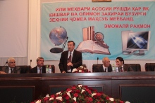 Бино ба иттилои Шервони Умриддин, котиби матбуотии АИ ҶТ Сессияи илмиро ноиби президенти Академияи илмҳои Ҷумҳурии Тоҷикистон, академик Кароматулло Олимов ифтитоҳ намуда, перомуни хизматҳои барҷастаи устод Садриддин Айнӣ дар рушди забон, адабиёт, таърих, фарҳанг ва илми тоҷик мухтасар сухан ронд.
