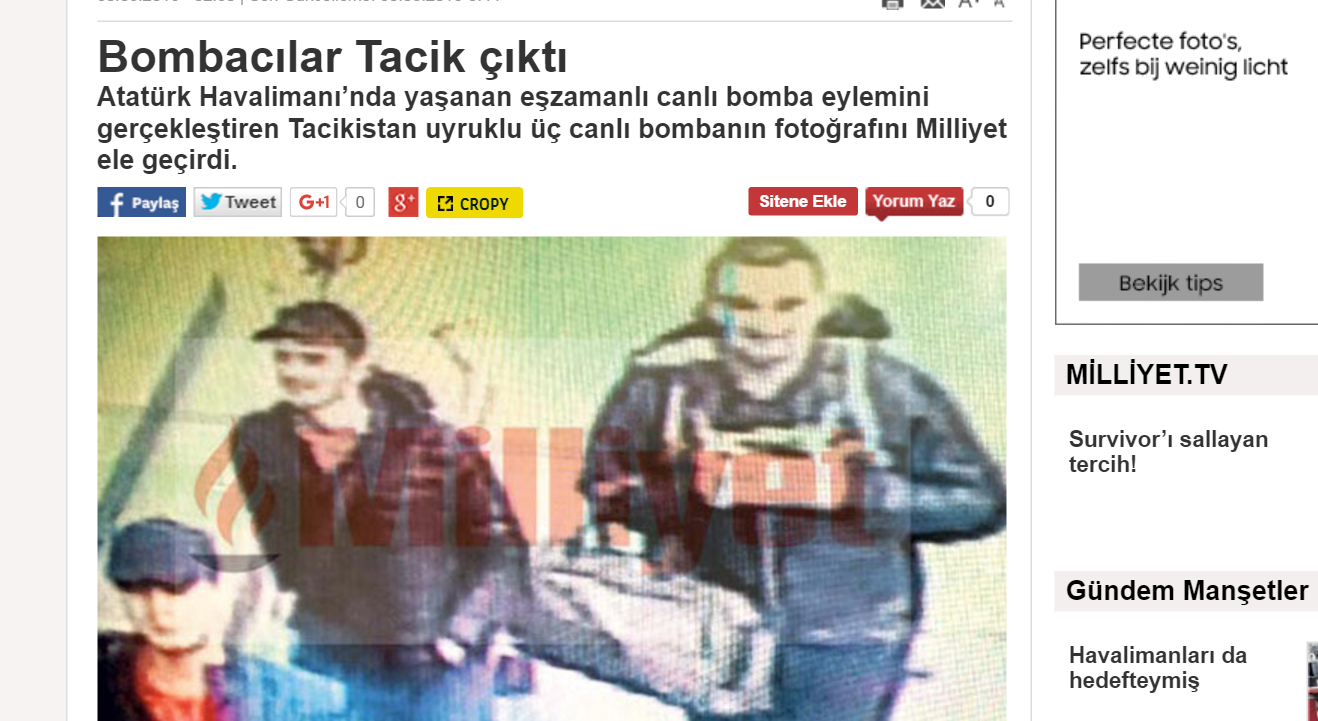 Амали террористӣ дар фурудгоҳи ба номи Отатурки шаҳри Истанбул кори дасти зодагони Тоҷикистон аст. Дар ин бора бо чопи аксҳои 3 нафар террорисони маргталаб нашрияи туркии