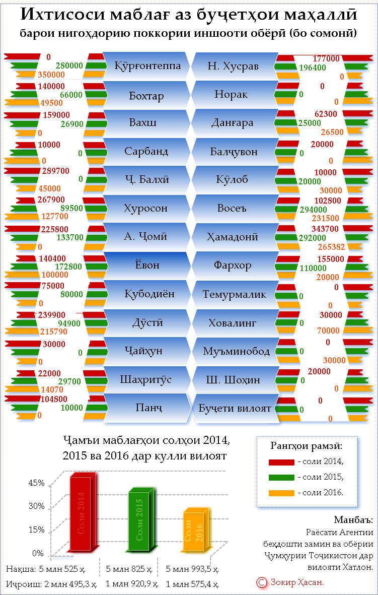 Ҳамрадиф иттилоъ дода шуд, ки аз 25 шаҳру навоҳии вилоят дар солҳои 2014 – панҷ, 2015 – даҳ ва 2016 – дувоздаҳ шаҳру ноҳия аз буҷети маҳаллӣ баҳри амалисозии тадбирҳои мелиоративӣ ягон сомонӣ ихтисос надоданд. Ва тӯли ин се сол аз буҷети вилоят низ маблағ ҷудо нагардид.