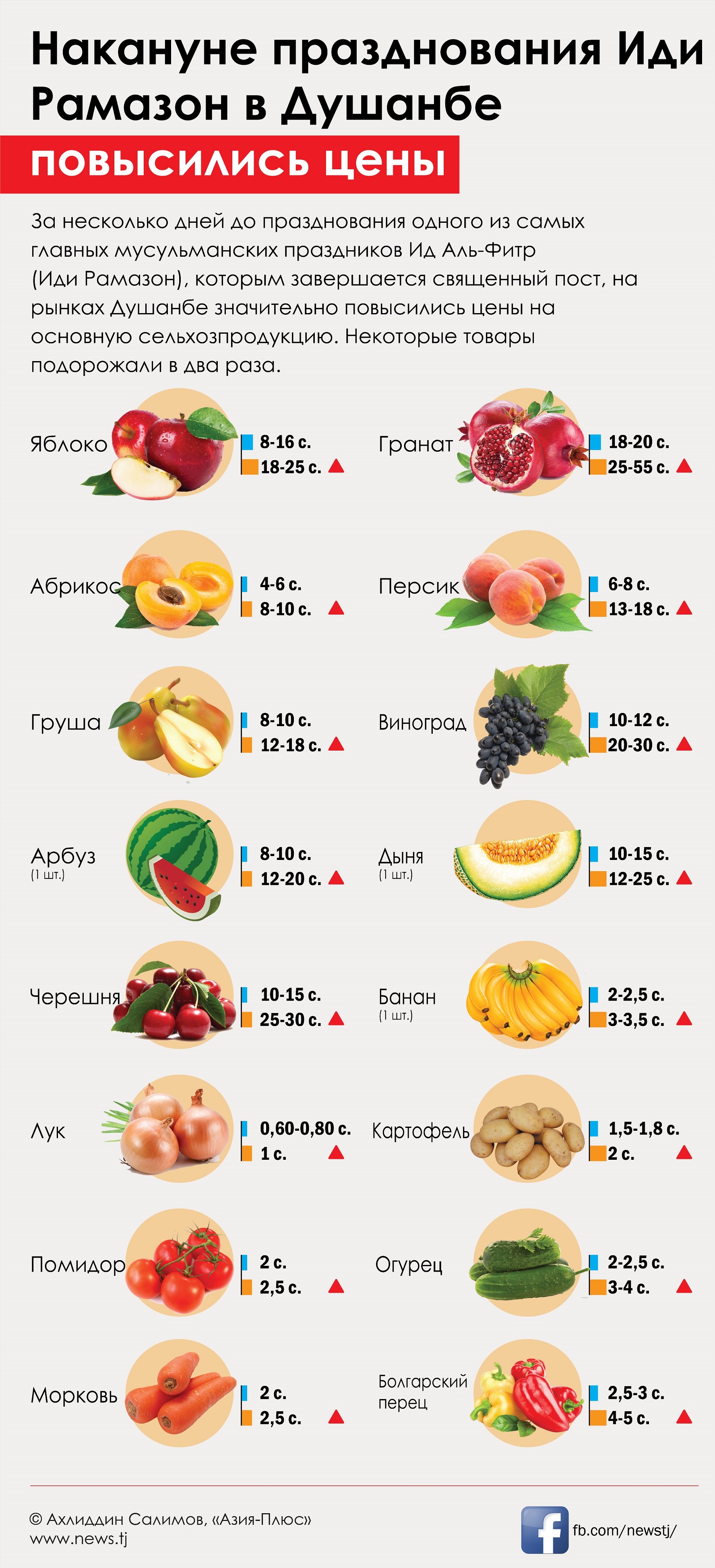 Чанд рӯз пеш аз таҷлили ҷашни яке аз идҳои асосии мусалмонон – Ид Ал-Фитр (Иди Рамазон), ки бо он рӯзадорӣ дар ин моҳи шариф ба итмом мерасад, дар бозорҳои шаҳри Душанбе нарху наво ба маҳсулоти кишоварзӣ боло рафт. Арзиши баъзе аз маҳсулот ду баробар афзуд.