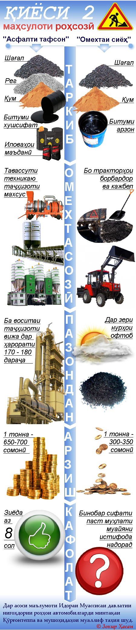 Аз рӯйи мушоҳидаи мо, муассисаҳои давлатии нигоҳдории роҳҳои автомобилгард шағал, қум ва битумро дар зери нури офтоб омехта, барои пур кардани чуқурчаҳои роҳ истифода мекунанд. Ба гуфтаи масъулин, чунин маҳсулот назар ба “асфалти тафсон” як баробар арзон аст, аммо сифаташро ягон сохтор кафолат намедиҳад. “Омехтаи сиёҳ” (асфалти хом) дар аввалин рӯзҳои боришот ё пас аз гузаштани мошинҳои гаронвазн ба зудӣ аз ҳам мерезад. Ин нуктаро зимни суҳбат мутахассисону ронандагон ҳам тасдиқ карданд.