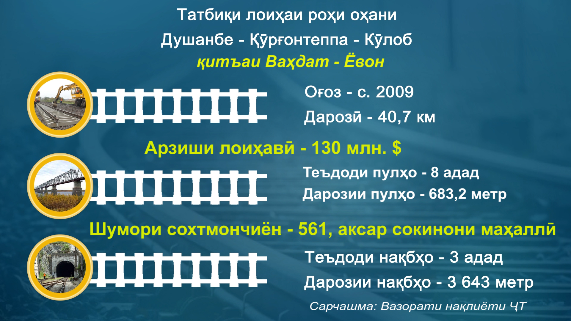Раисҷумҳури Тоҷикистон Эмомалӣ Раҳмон рӯзи 15-уми майи соли 2015 зимни суханронӣ дар маросими оғози корҳои сохтмони нақб дар масири роҳи оҳани Ваҳдат-Ёвон чунин гуфта буд: «Алҳол аз лиҳози мавқеи ҷойгиршавии ҷуғрофӣ роҳи оҳани Тоҷикистон аз се қитъа иборат мебошад, вале ин қитъаҳо аз ҳамдигар ҷудо буда, танҳо баъди убури ҳудуди кишварҳои ҳамсоя бо ҳамдигар пайваст мешаванд, ки чунин ҳолат душвориҳои зиёдеро пеш меорад. Дар сурати ба кор оғоз намудани қитъаи роҳи оҳани Ваҳдат-Ёвон, ки мо имрӯз ба бунёди нақбҳои он шурӯъ намудем, барои корҳои бору мусофиркашонӣ аз марказ ба ҷануби мамлакат имконияти беҳтарин муҳайё гардида, масофаи роҳ хеле кӯтоҳ мешавад».