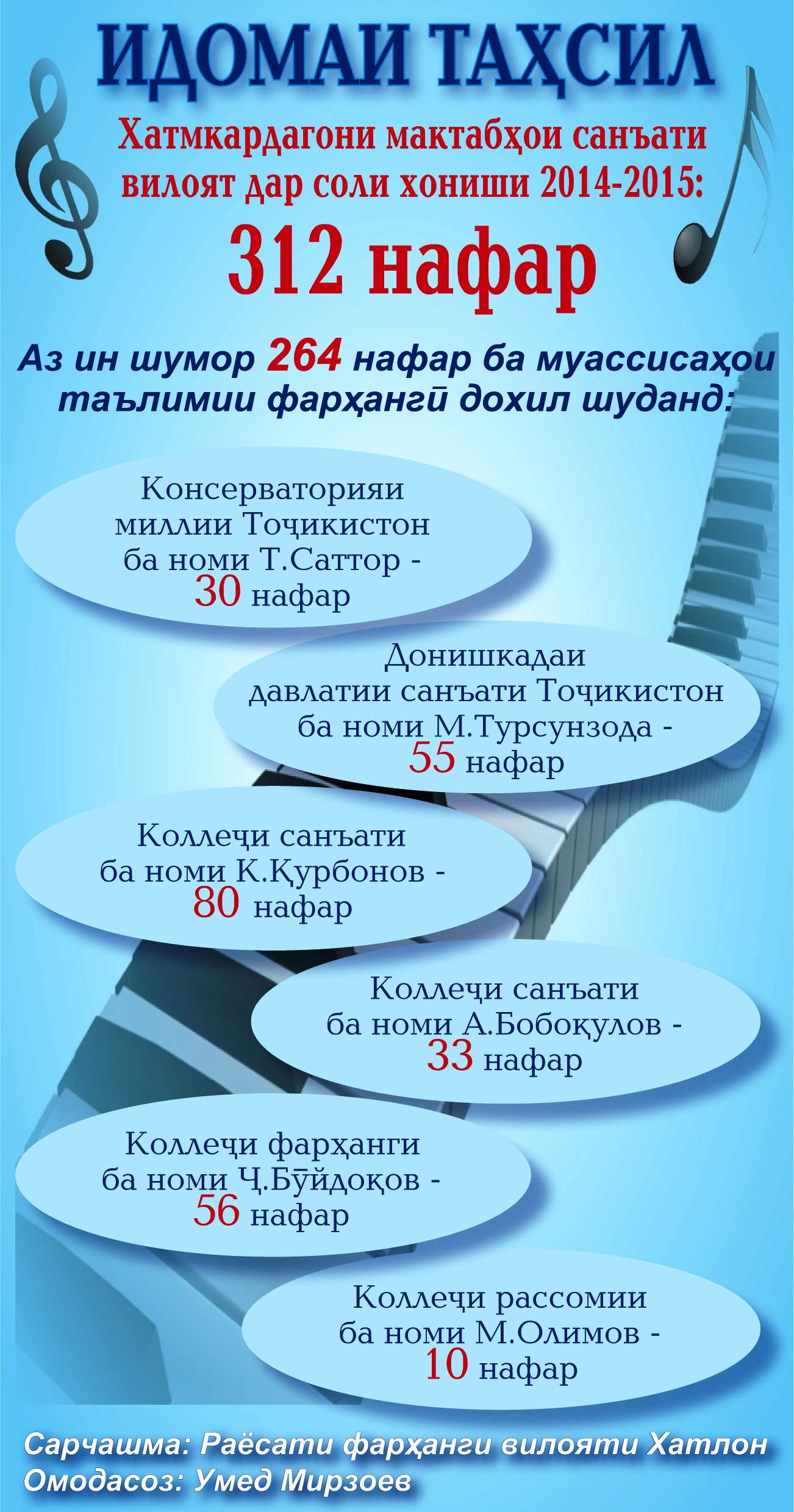 «Ба дарси мусиқӣ дар мактабҳои таҳсилоти миёнаи умумӣ беэътиноӣ зоҳир мешавад, ки ин барои ояндаи фарзандони мо хуб нест, – изҳор дошт Мавлуда Раҷабова, корманди Раёсати фарҳанги вилоят. – Масалан, ман ҳар чизе, ки омӯхтам, дар мактаби миёна омӯхтам. Пешниҳод мекунам, ки ақаллан ҳамон маҳфилҳои омӯзиши мусиқӣ дигарбора ташкил шаванд».