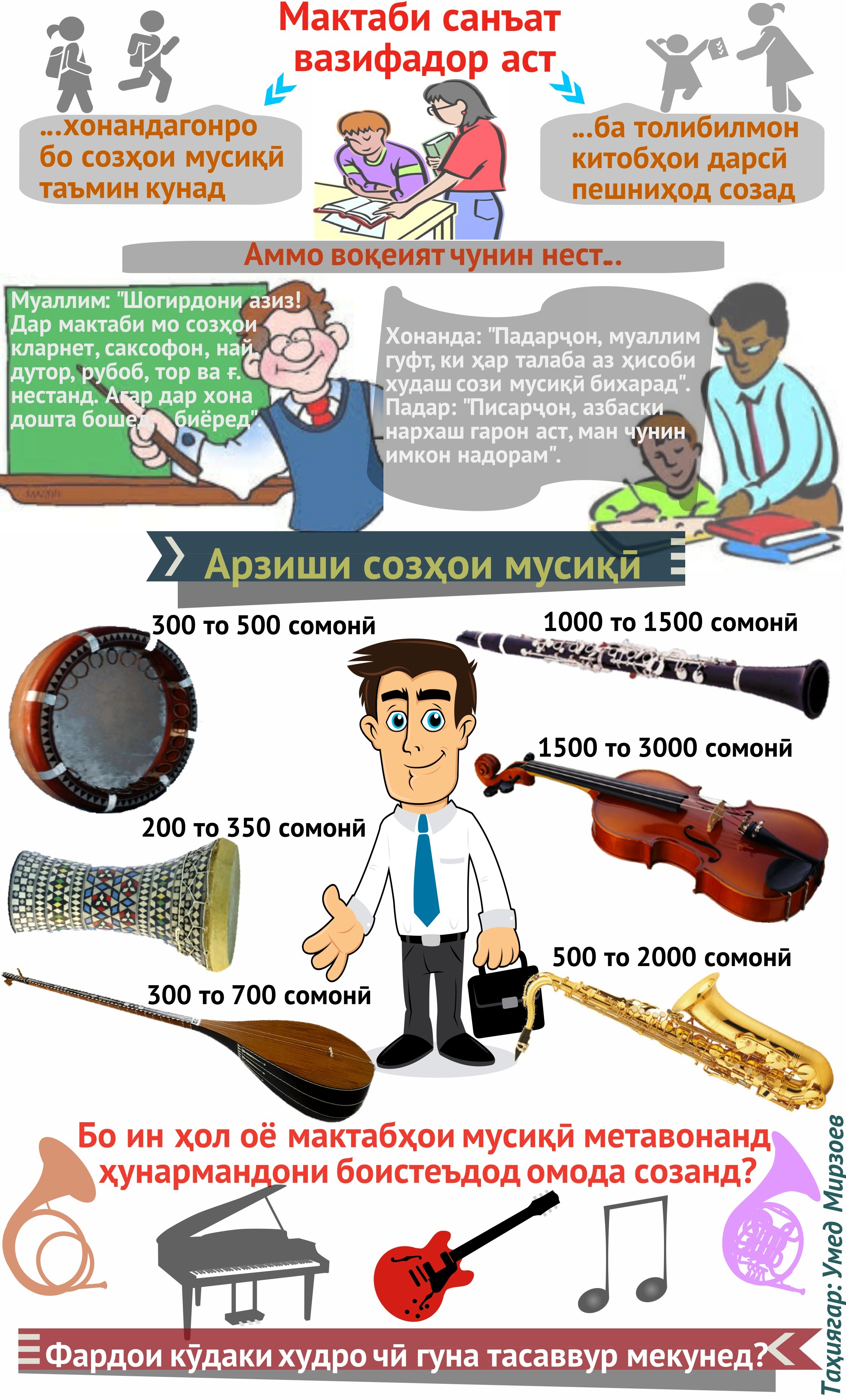«Се фарзандам дар мактаби мусиқии шаҳр таҳсил мекунанд. Ин боиси ифтихор аст. Аз он ки дар кӯча ба ҳар кори нолозим машғул шаванд, касб омӯзанд, сад бор беҳтар аст», – ба суҳбат пайваст сокини шаҳри Қӯрғонтеппа Ғоибназар Ҳайдаров.
