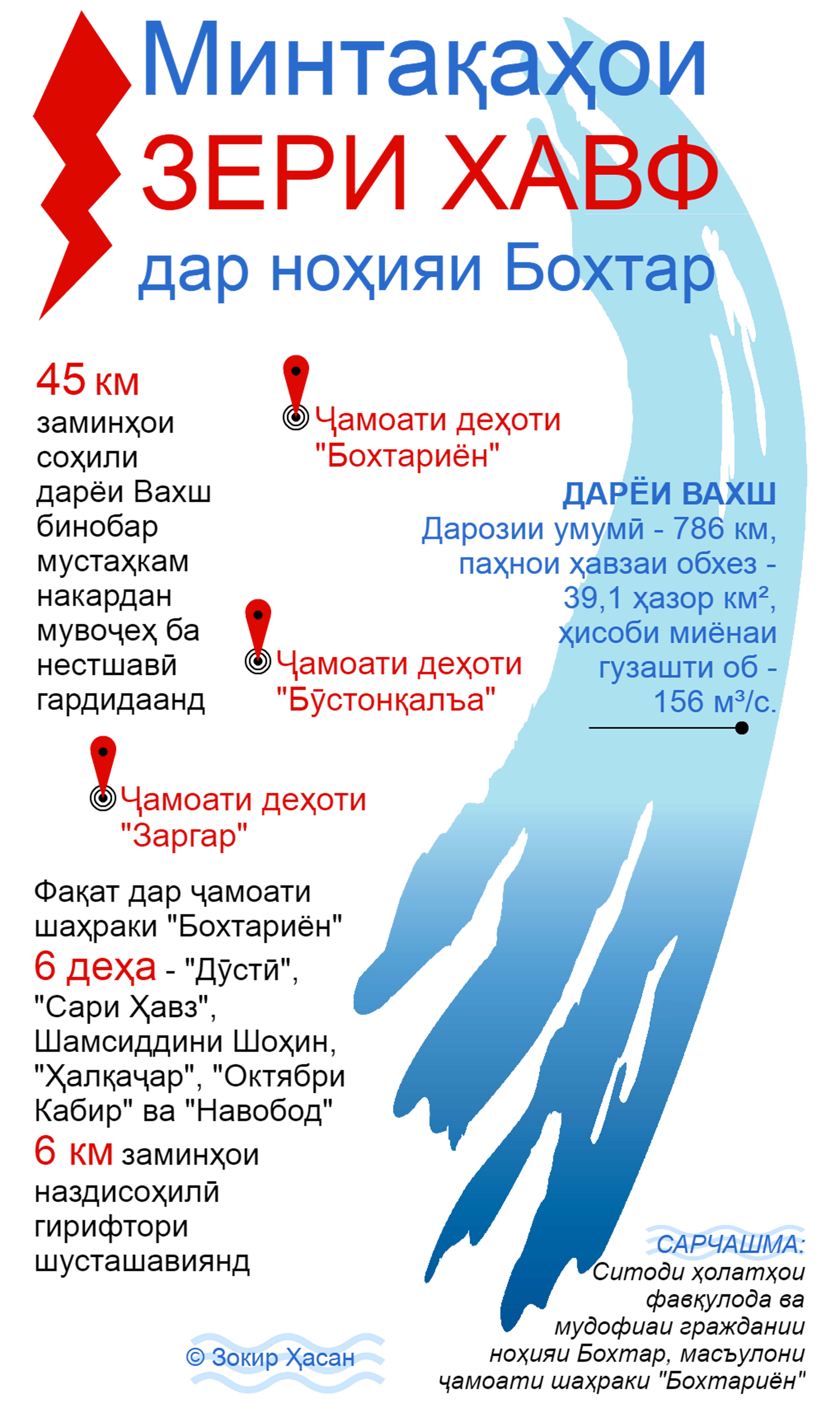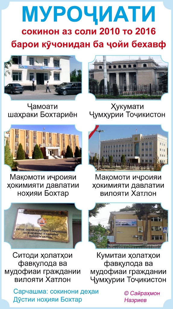 Ниҳодҳои дахлдори давлатӣ то куҷо аз ҳоли мардум воқифанд? Подполковник Абдулло Юнусов, сардори Ситоди ҳолатҳои фавқулодаи ноҳияи Бохтар бар ин назар аст, ки соҳилҳои дарёи Вахш бинобар маҷрои худро дигар кардани об гирифтори шусташавиянд: «Аз ин деҳа 83 хонавода бояд то соли 2020 ба мавзеи бехавф кӯчонида шаванд. Давоми се соли охир зиёда аз 3,5 километр заминҳои ҷамоати шаҳраки “Бохтариён” ба коми дарё рафтаанд. 20 оилаи деҳаи “Дӯстӣ” кӯчонида шуда, дар ҳамин шабу рӯз боз 3 оилаи дигар бо замини наздиҳавлигӣ таъмин шуданд».