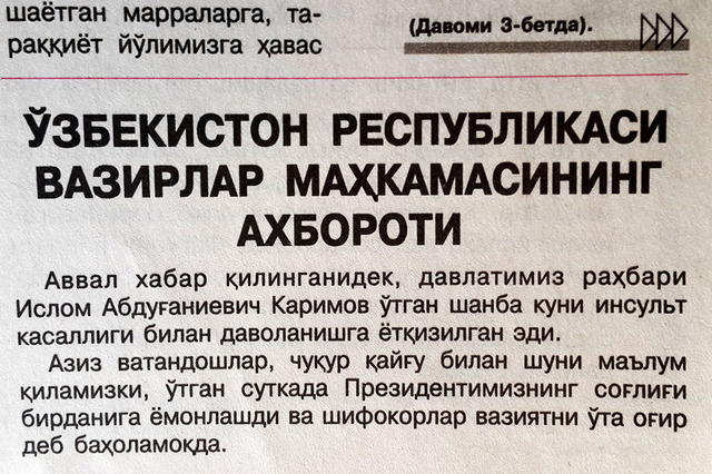 Дар ин маълумот Девони вазирони Ӯзбекистон ҳамчунин тасдиқ кардааст, ки Ислом Каримов сактаи майнаи сар (инсулт)-ро аз сар гузаронидааст.