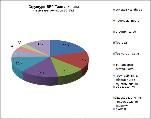 Бино ба маълумоти Агентии омори назди президенти ҶТ, дар сохтори ММД-и кишвар дар ин давра 20,3% – ба ҳиссаи бахши кишоварзӣ, шикор ва хоҷагии ҷангал, моҳидорӣ ва моҳипарварӣ, 14,9% – ҳиссаи саноат бо шумули энергетика, 14,4% – ба савдо, таъмири автомобилҳо, асбобҳои маишӣ ва лавозимоти гигиенаи шахсӣ, меҳмонхонаҳо в атарабхонаҳо, 12,3% – ба нақлиёт, алоқа ва хоҷагии анбор, 11,7% – ба андозҳо ва 10,8% – ба ҳиссаи сохтмон рост меояд.