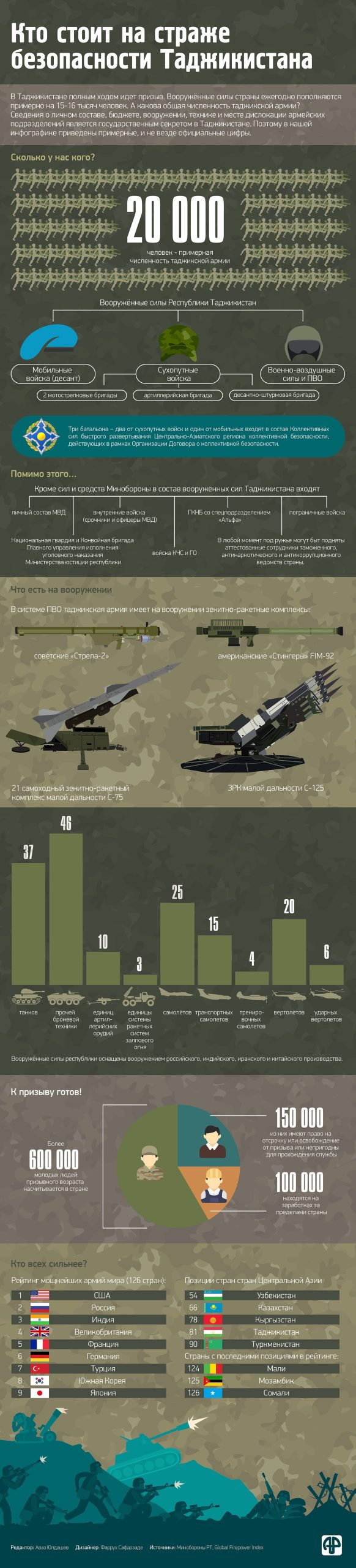 Дар остонаи анҷоми маъракаи даъвати тирамоҳӣ ба хизмати ҳатмии ҳарбӣ дар сафи Қуваҳои Мусаллаҳи Тоҷикистон инфографикаеро манзуратон магрдонем, ки дар он доир ба сохтор, таркиб ва иқтидори низомии Қувваҳои Мусалалҳи ҷумҳурӣ маълумот дода мешавад.
