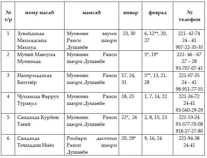 Эзоҳ: рӯзҳои бидуни ситорача – навбатдорӣ аз соати 19-и шом то 8-и субҳ, рӯзҳо бо 1 ситорача (*) – навбатдорӣ аз 8-и субҳ то 17-и шом, рӯзҳо бо 2 ситорача (**) – навбатдорӣ аз соати 17-и шом то 8-и субҳ.