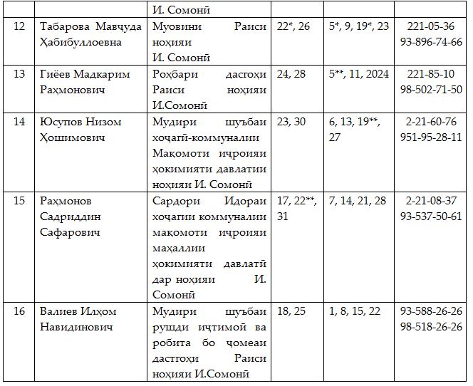 Раиси нави шаҳри Душанбе Рустами Эмомалӣ муовинони худ ва муовинони раисони чор ноҳияи пойтахтро ба навбатдории шабонарӯзӣ уҳдадор кард. Тамоми рақамҳои телефони робита бо ҷадвали навбатдорӣ дар торнамои расмии мақомоти шаҳрдорӣ – Dushanbe.tj нашр шудааст.