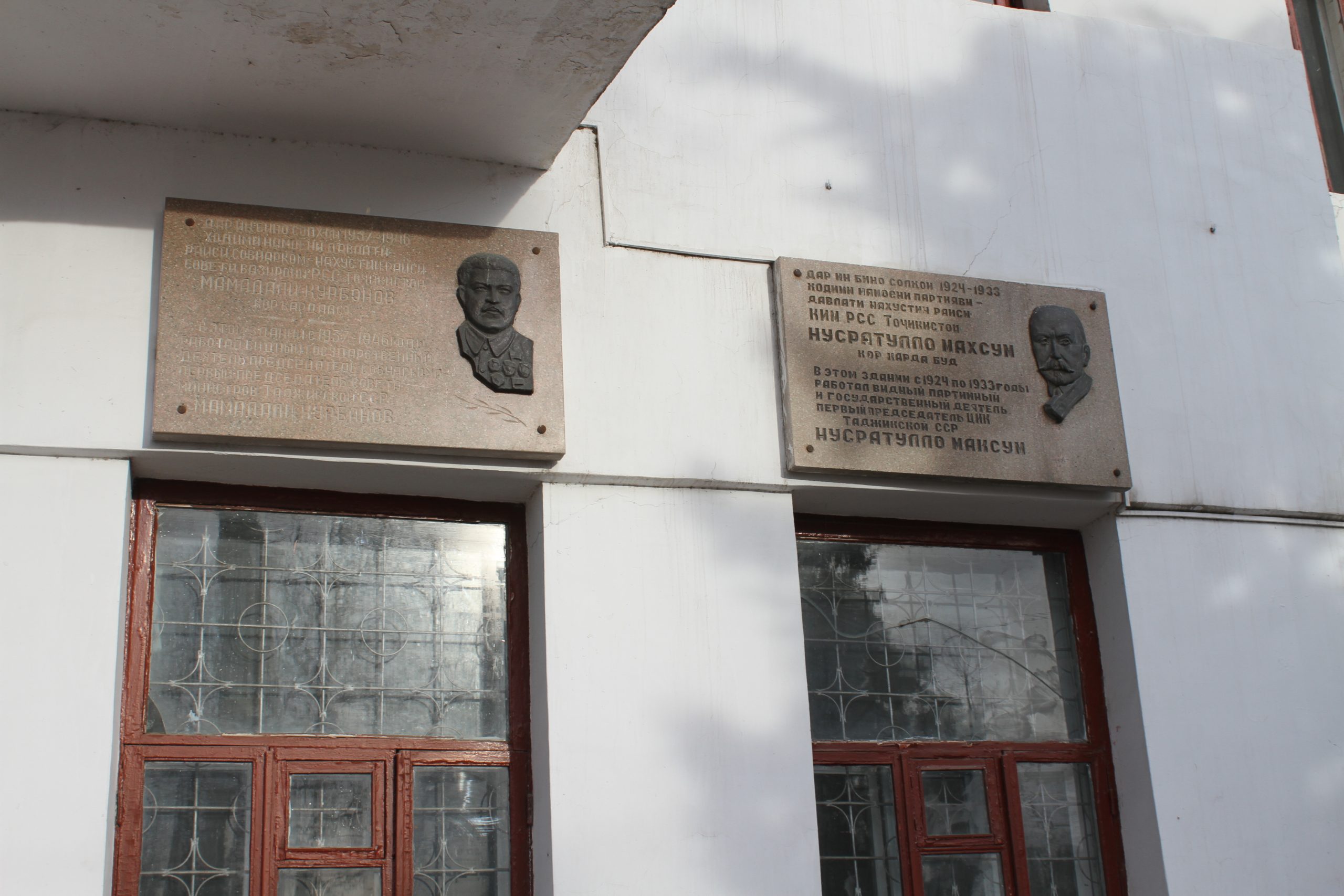 ИЗОБРАЖЕНИЕ Лавҳаҳои ёдгории Нусратулло Махсум ва Маҳмадалӣ Қурбонов дар бинои Вазорати кишоварзии ҶТ