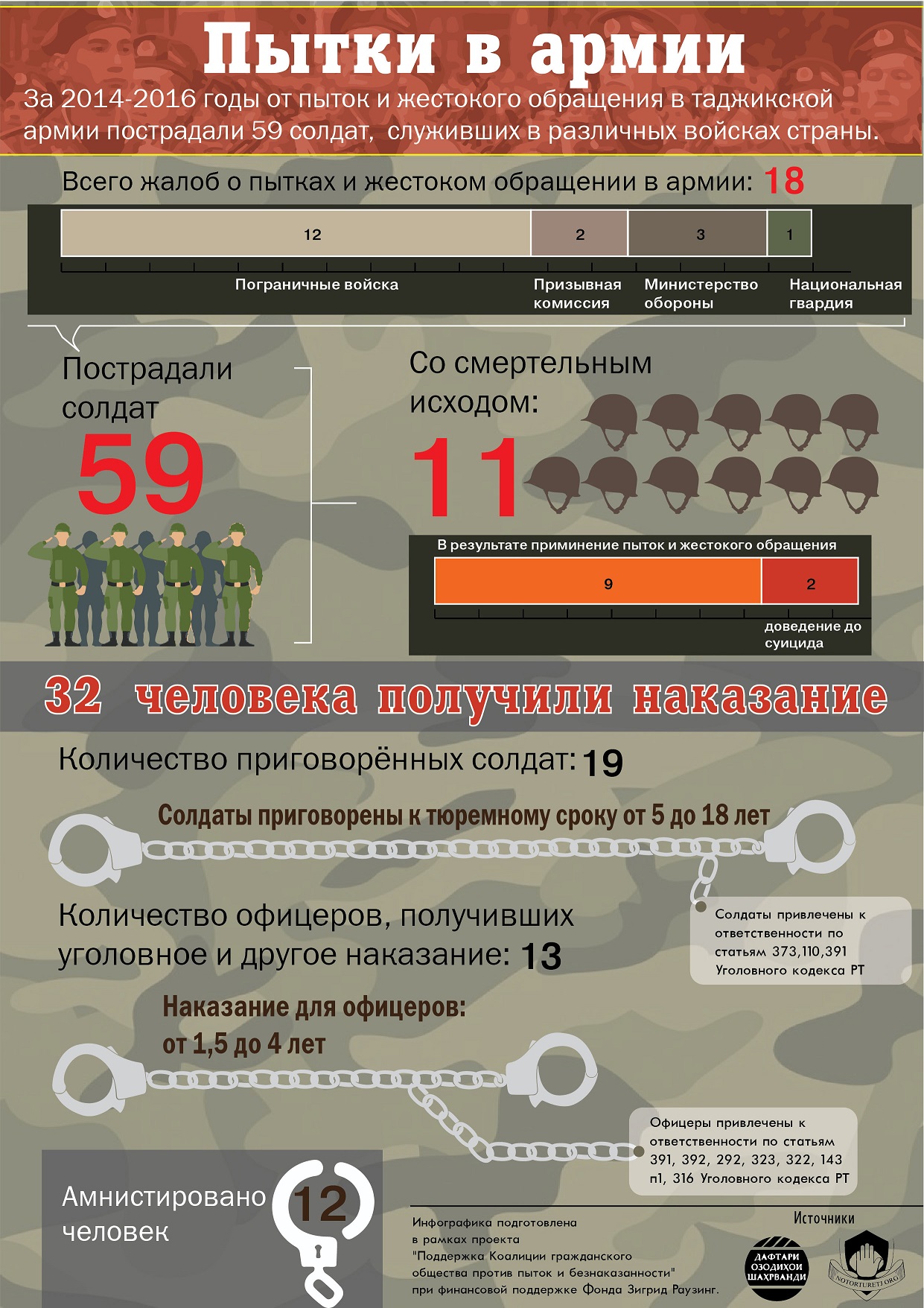 Эътилофи ҷомеаи шаҳрвандӣ зидди шиканҷа ва беҷазоӣ дар Тоҷикистон хабар медиҳад, ки барои роҳ додан ба муносибатҳои берун аз оиннома 32 нафар хизматчиёни ҳарбӣ муҷозот шуда, 12 нафари онҳо мавриди авф қарор гирифтаанд.