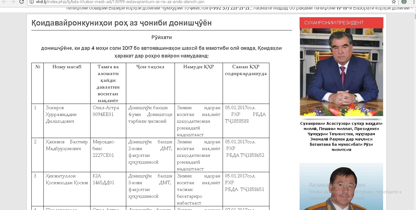 Вазорати корҳои дохилии Тоҷикистон дар сомонаи расмиаш рӯйхати донишҷӯёнеро, ки тайи 4 моҳи охир қоидаҳои ҳаракат дар роҳро риоя накардаанд, ба нашр расонид. Ҳамаи онҳо ба дарсҳо бо автомашинаҳояшон меомадаанд.