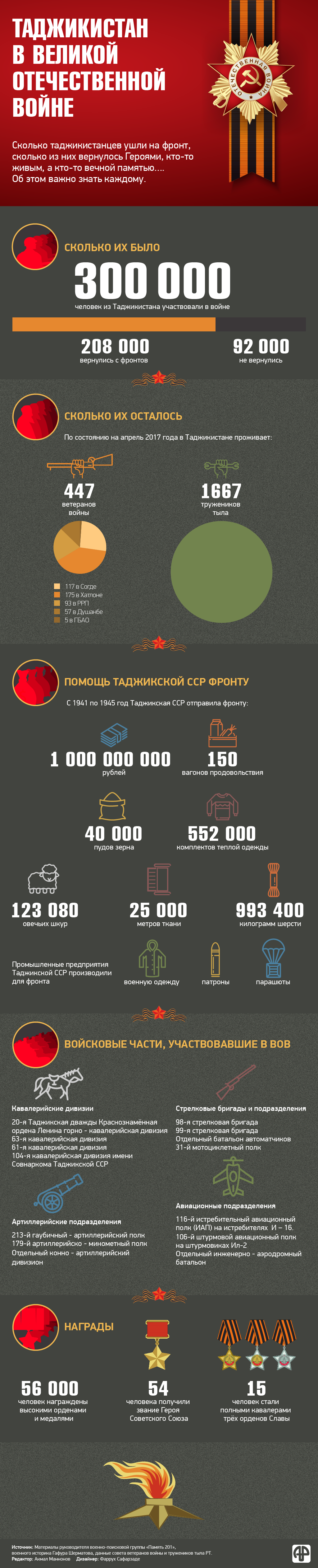 Ҳар кадоме аз се нафари онҳо дигар ба хона барнагашт. Ҷумҳурӣ ба фронт бо пулу зироати ғалладона ва дигар маҳсулоти ғизойӣ кумак мекард. Доир ба саҳми Тоҷикистон дар ғалабаи умумӣ дар инфографикаи мо маълумоти бештар дарёфт карда метавонед.