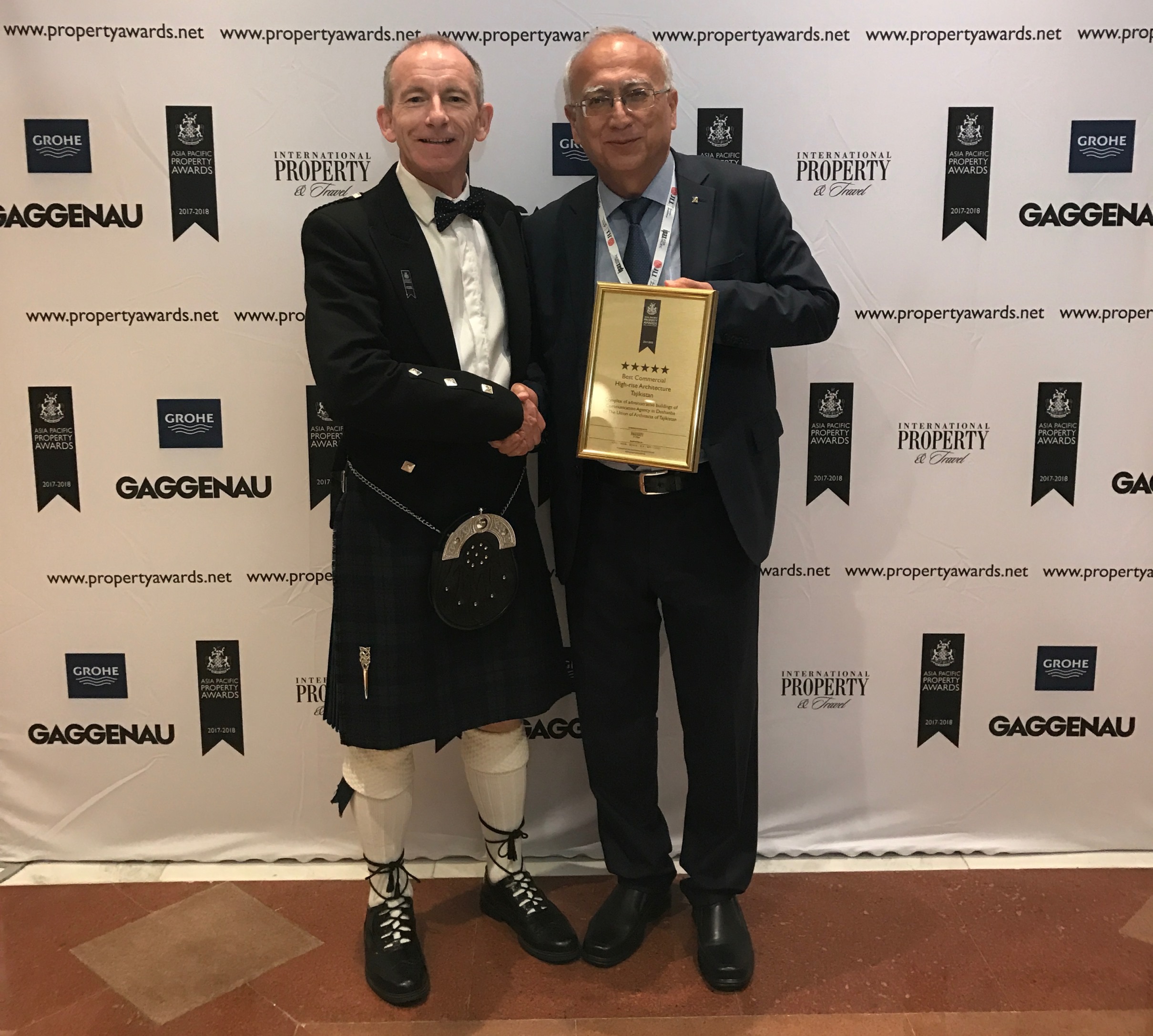 Тарҳи "Маҷтамаи биноҳои маъмурии Хадамоти алоқа дар Душанбе” дар озмуни байналмилалии International Property Awards дар Таиланд дар байни беҳтарин тарҳҳои сохтмонии қораи Осиё ва Уқёнусия сазовори ҷоизаи баланди панҷситорагӣ шуд.