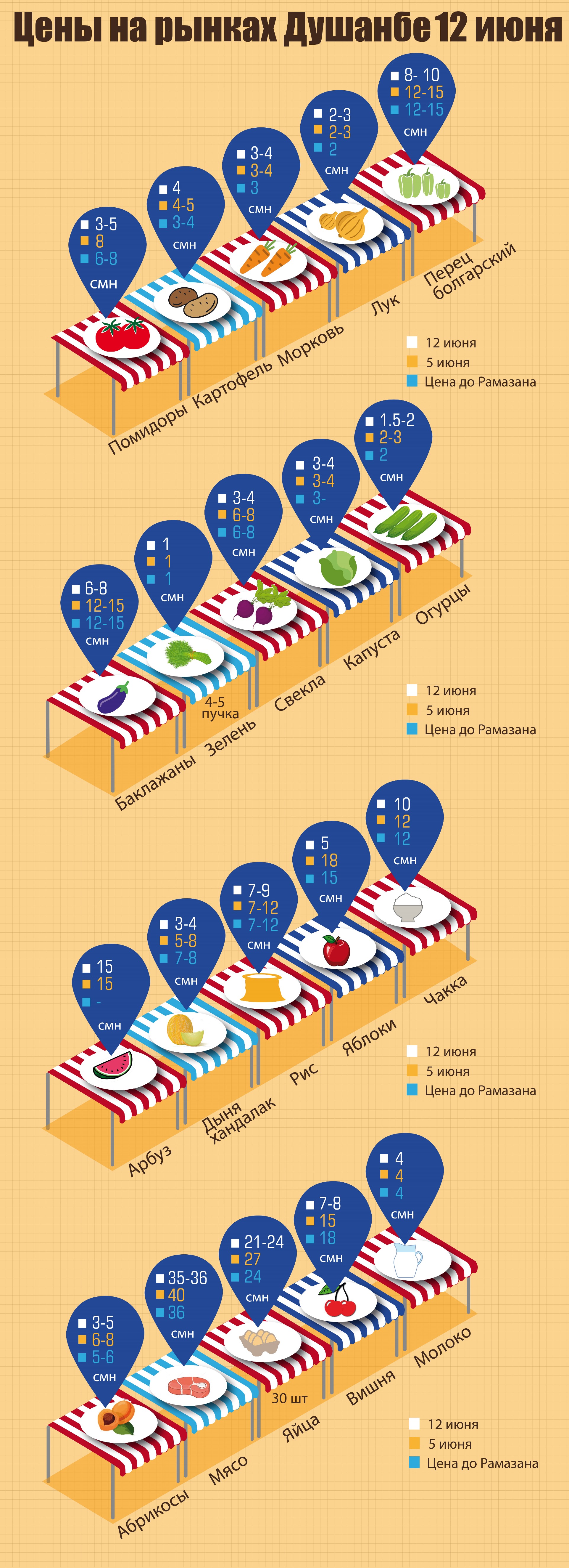 Қобили зикр аст, ки нархҳо дар минтақаҳои кишвар хеле зиёд фарқ доранд, аз ин рӯ, бо таваҷҷуҳ ба «воридкунанда»-и асосии маҳсулоти кишоварзӣ будани шаҳри Душанбе, мо нархҳо танҳо дар пойтахтро зикр мекунем.