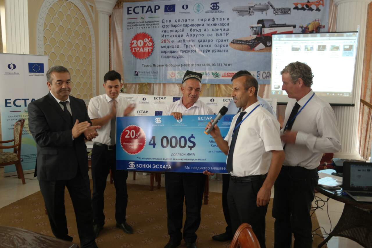 Усмоналӣ Муродалиев аз ноҳияи Шаҳритӯс ва Ислом Абдиев аз ноҳияи Носири Хисрави вилояти Хатлон, ки мизоҷони Бонки Эсхата маҳсуб меёбанд дар рафти чорабинии “Рӯзи дарҳои кушоди лоиҳаи баланд бардоштани рақобатпазирии агробизнес дар Тоҷикистон” соҳиби 20% маблағи гранти бебозгашт аз ҳаҷми умумии қарз гардиданд.