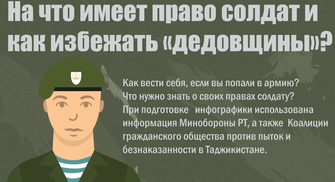 Сарбози Артиши Тоҷикистон ба озодӣ аз хушунат, «бузургсолорӣ» (дедовшина), таҳқир ва боз дигар амалҳои номақбул нисбаташ ҳуқуқ дорад. Инфографикаи навбатии мо ба касоне нигаронида шудааст, ки ба тозагӣ хизматро оғоз кардаанд. Он дар беҳтар фаҳмидани ҳуқуқҳоятон ба Шумо кумак мекунад.