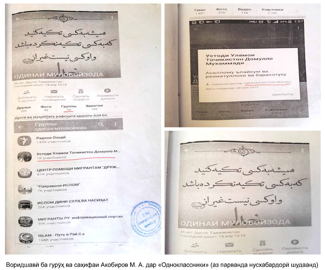 Зимнан, иттилоъ дода шуд, ки Суди вилоят бо баррасии парвандаи Акобиров Муҳсин Абдулазизович, сокини ноҳияи Ҷайҳун, ки дар “Одноклассники” бо номи “Устоди уламои Тоҷикистон домулло Муҳаммадӣ” аз 28-уми майи соли 2012 то моҳи апрели соли ҷорӣ гурӯҳеро гардон карда, ҳамзамон, саҳифаи хусусие зери унвони “Одинаи Муллобойзода” боз карда будааст, латмаи чашмрасе ба кори экстремистону террористон зад. Акобиров бо нашри баъзе маводҳои зоҳиран динӣ Ҳукумати Тоҷикистонро “ҳам кофир ва ҳам золим…” (иқтибос аз парванда) арзёбӣ карда, дар интиҳо ҳамагонро ба ҷиҳоди мусаллаҳона даъват кардааст. Барои ин кирдорҳо номбурда тибқи Кодекси ҷиноятии Ҷумҳурии Тоҷикистон ба 8 соли зиндони дорои низоми сахт ва то як сол маҳрум шудан аз ҳуқуқи фаъолият дар ташкилотҳои динӣ маҳкум шуд.