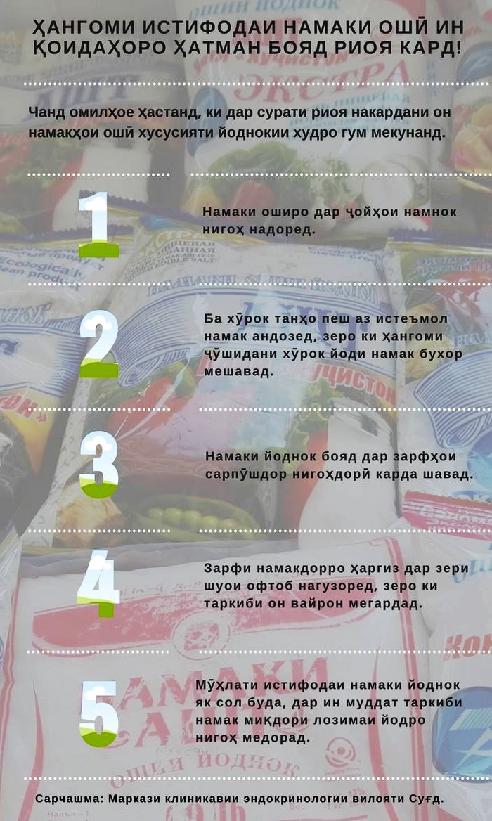 Мутахассисон изҳор медоранд, ки ҳар як нафар ҳангоми харидорӣ ва истифодаи намаки ошӣ бояд ба сифат, таркиб, йоднокӣ, санаи истеҳсол ва нигаҳдории он дар шароити хона аҳамият дода, бо ин роҳ саломатии худ ва аҳли оиларо ҳифз намояд.