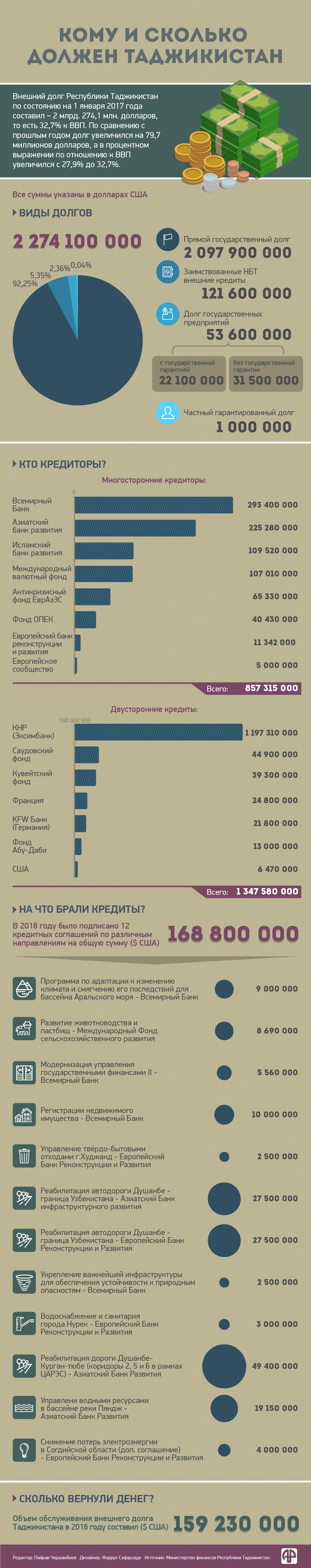 Айни замон қарздиҳандаи асосии Тоҷикистон Чин мебошад, ки беш аз нисфи ҳаҷми умумии қарзи хориҷӣ ба он рост меояд: мо ба ин кишвари ҳамсоя наздики 1,2 млрд. доллар қарздорем.