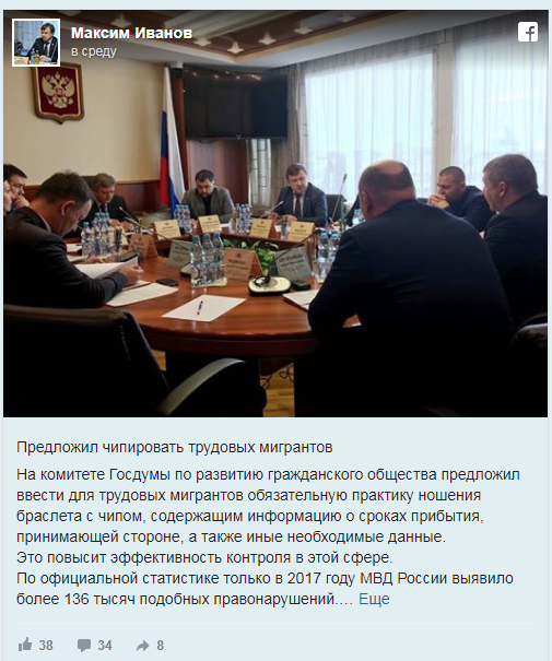Максим Иванов, вакили Думаи давлатӣ, палатаи поёнии парлумони Русия аз ҳизби ҳокими "Единая Россия” рӯзи 28 март дар ҷаласаи кумитаи рушди ҷомеаи шаҳрвандӣ, созмонҳои ҷамъиятӣ ва динии Дума пешниҳод кардааст, то тамоми муҳоҷирони кориро ба гардондани дастбанд(браслет)-и чипдор маҷбур кунанд.