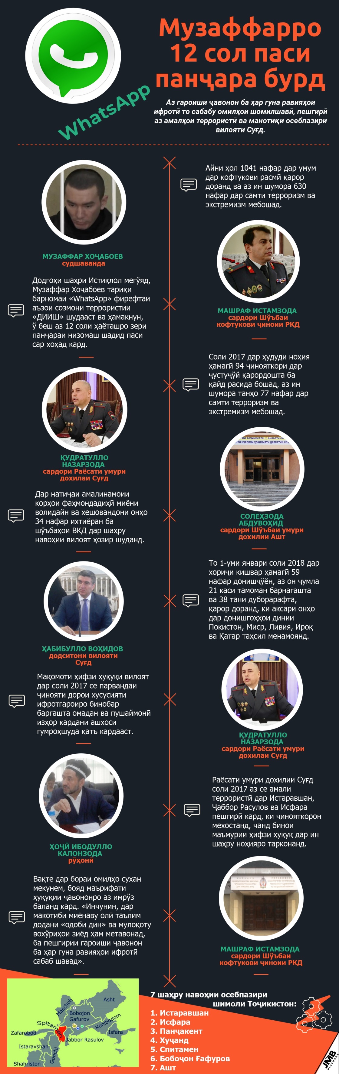 Музаффар Хоҷабоев тариқи барномаи «WhatsApp» фирефтаи аъзои созмони террористии «ДИИШ» шудааст ва додгоҳ ўро беш аз 12 сол паси панҷараи низомаш шадид равон кардааст.