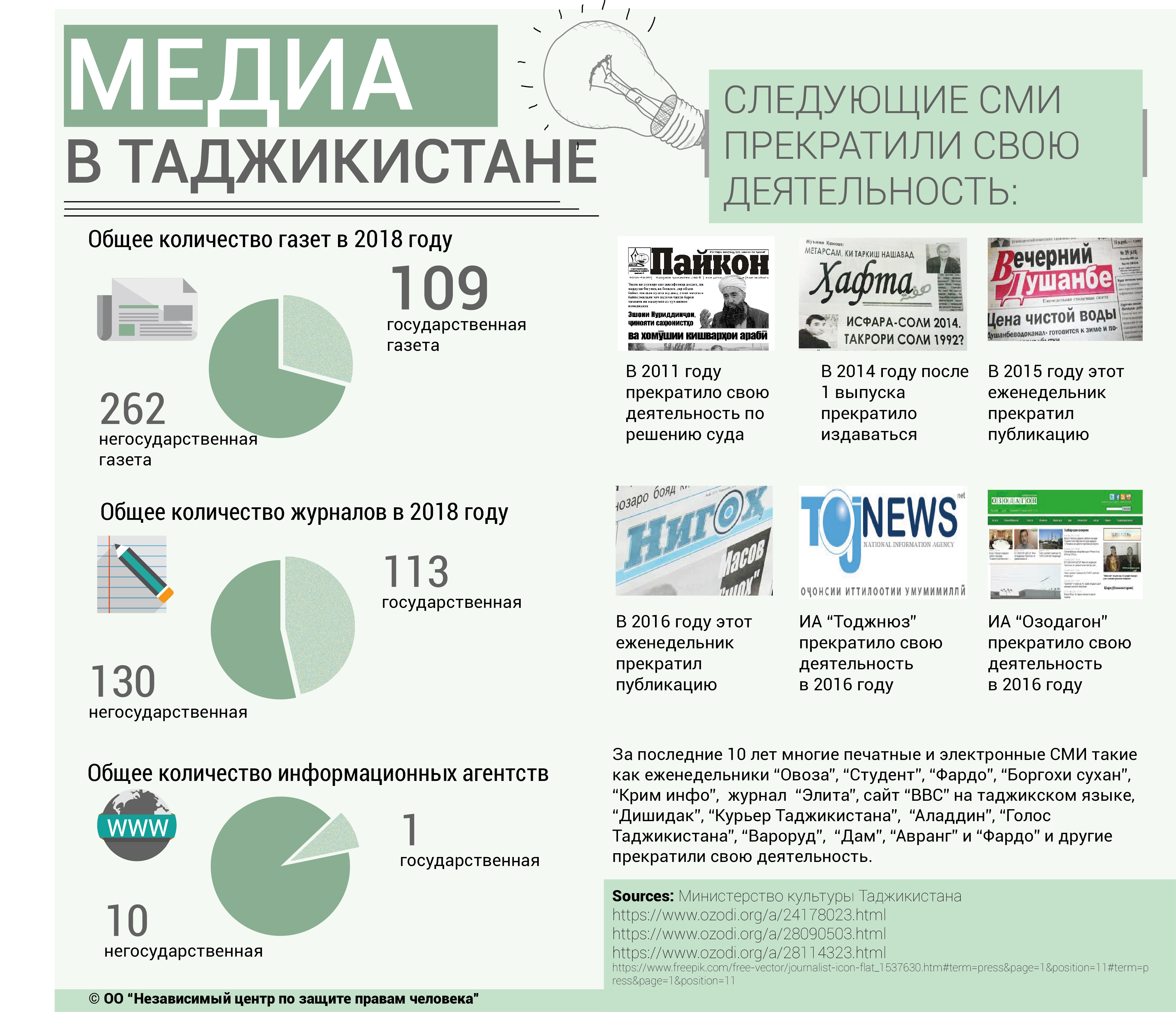 Дар ҳамин ҳол, ТҶ «Маркази мустақили ҳуқуқи инсон» дар бораи қатъи фаъолияти ВАО-и чопӣ ва электронии Тоҷикистон тайи 10 соли охир инфографика таҳия намудааст.