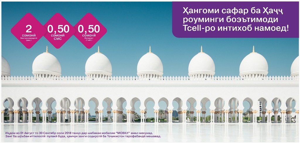 Барои мусалмонони олам мавсими Ҳаҷ- зиёрати Хонаи Худо ва амокини муқаддас фаро мерасад. Ширкати Tcell ҳамчун анъана ҳафт сол боз, шурӯъ аз соли 2012 зоиронеро, ки ба зиёрати Каъба мераванд, дастгирӣ мекунад. Tcell ба ҳоҷиён имкон фароҳам меорад, то маблағи зиёдро барои тамосҳои байналмилалӣ сарф накунанд! Имсол бошад, ширкати Тсеll арзиши роумингро боз ҳам коҳиш дод!