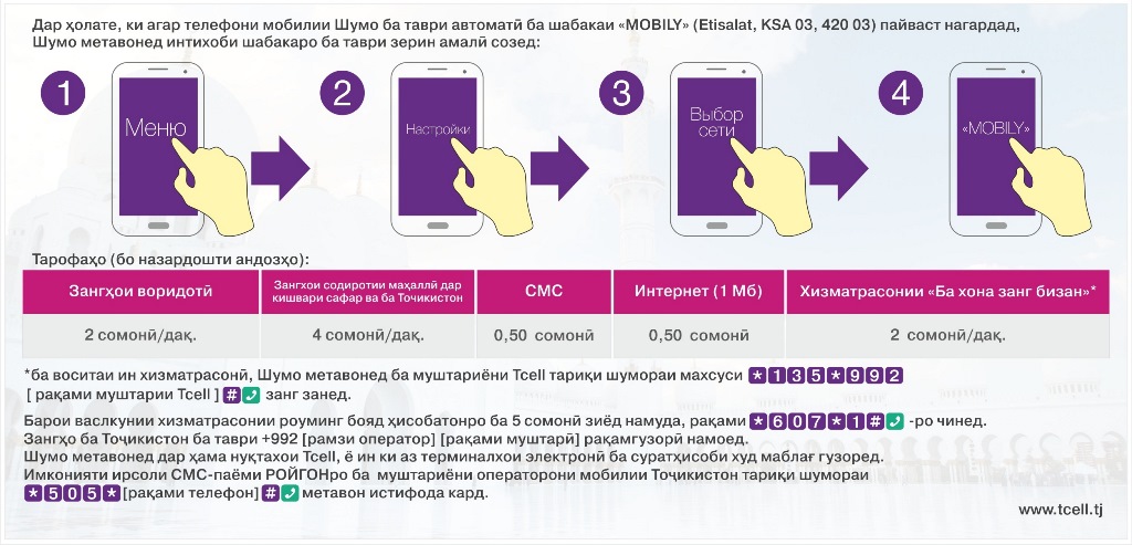Барои пайваст шудан ва барқарор кардани робита бо хона танҳо лозим аст, ки симкорти хонагӣ аз Tcell-ро гирифта, онро ба оператори маҳаллии Ettihad Etisalat (MOBILY) дар Арабистони Саудӣ пайваст намоед. Агар телефон ба таври автоматӣ ба шабакаи MOBILY пайваст нашуда бошад, метавонед ба бахши танзими телефон (настройка) даромада, ба таври дастӣ онро фаъол намоед.