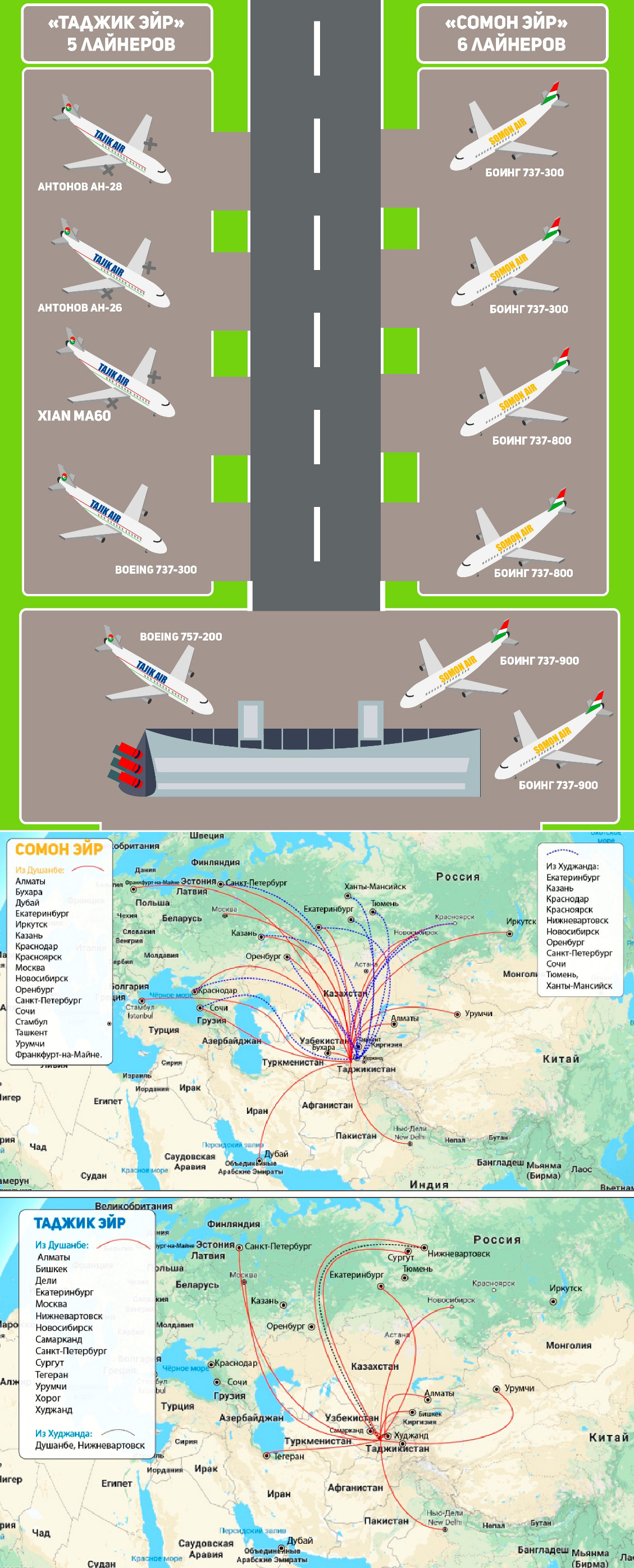 Дар инфографикаи зер доир ба ҳавопаймоҳои ширкатҳои Тоҷикистон ва самти парвозҳои онҳо маълумот дода мешавад.