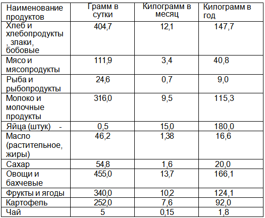 Ҳамин тариқ, мутобиқи меъёрҳои тавсияшадаи истеъмол, як нафар давоми шабонарӯз бояд 404 грам нон ва маҳсулоти нонӣ, 111 грамм гӯшт ва маҳсулоти гӯштӣ, 25 грамм моҳӣ ва маҳсулоти он, 316 грамм шир ва маҳсулоти ширӣ, ҳамчунин нимто тухм истеъмол намояд.