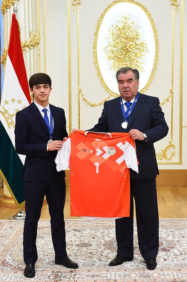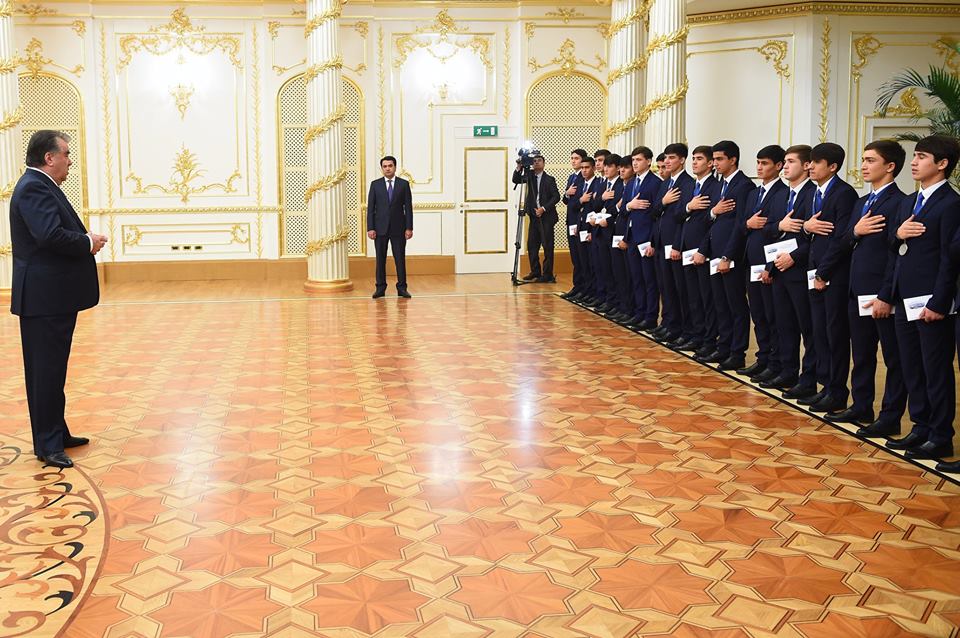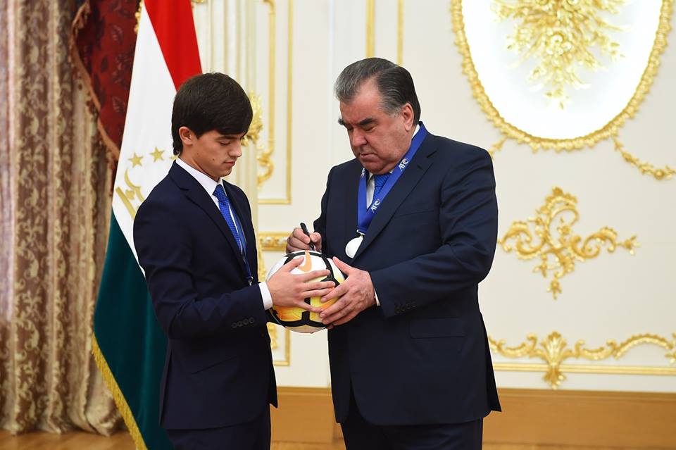 Президенти Тоҷикистон Эмомалӣ Раҳмон бо раиси шаҳри Душанбе Рустами Эмомалӣ дастаи мунтахаби футболбозони навраси то 16 – солаи Тоҷикистонро бо нишони қадршиносӣ ба ҳузур пазируфтанд.
