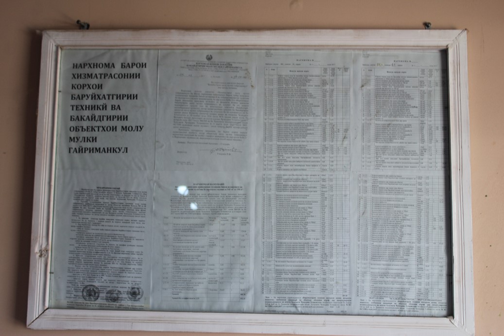 Дар мавриди нархномаҳои КФД “Бақайдгирии молу мулки ғайриманқул”- и шаҳру навоҳии вилоят гуфтанием, ки ҳангоми сафарҳои хизматӣ мушоҳида кардаем, ки дар даромадгоҳҳо корхонаҳо нархномаҳои хизматрасониҳо насб шудаанд. Вале онҳо ё бо хати хурд навишта шудаад, ё хеле баланд овезон карда шудаанд. Аз ин рӯ, на ҳар кас метавонад ба хотири гумони ғайр набурдан бо онҳо шинос шавад.