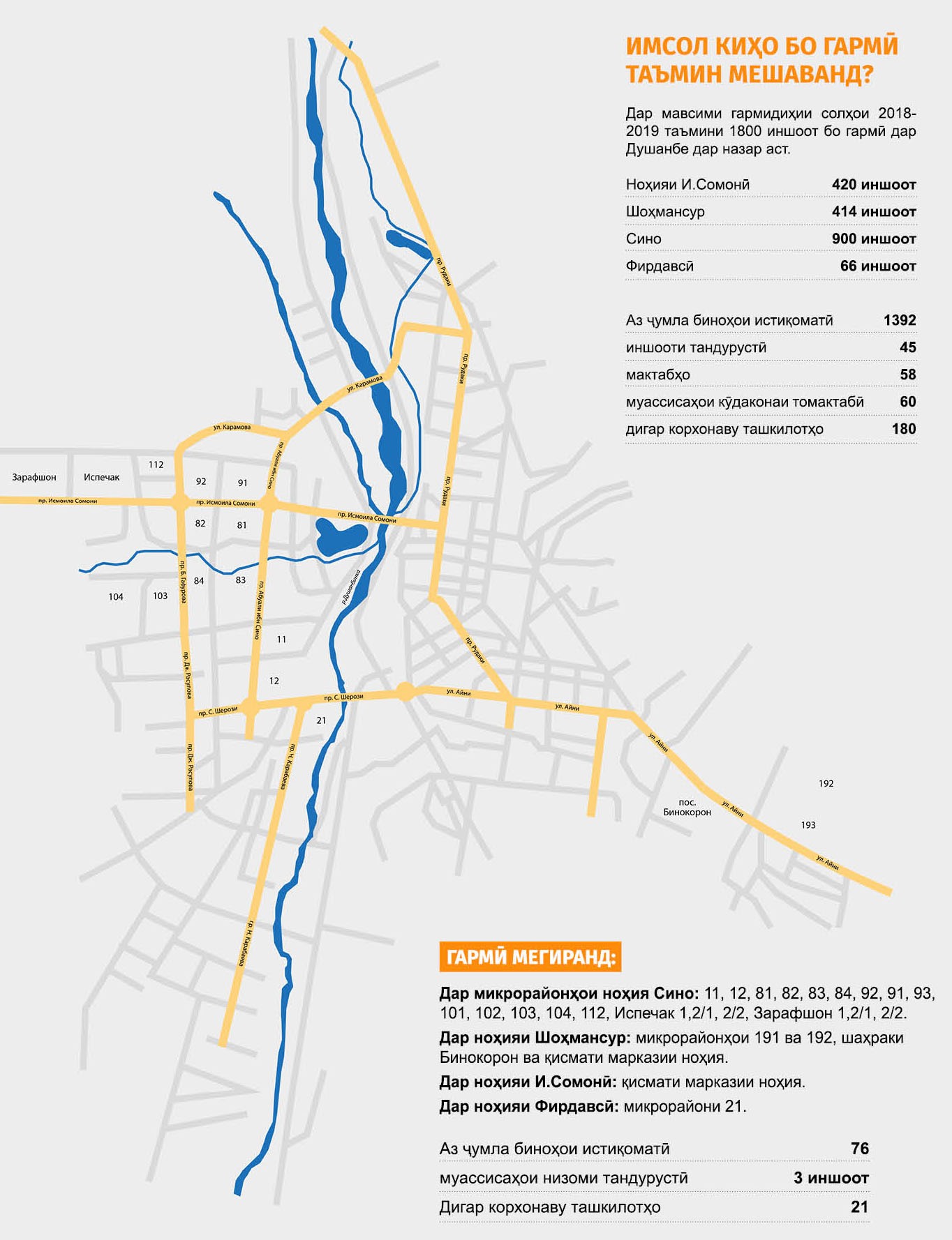Бубинед ба кадом иншоот, маҳалла, кӯча ва хонаҳои Душанбе имсол гармӣ дода мешавад.