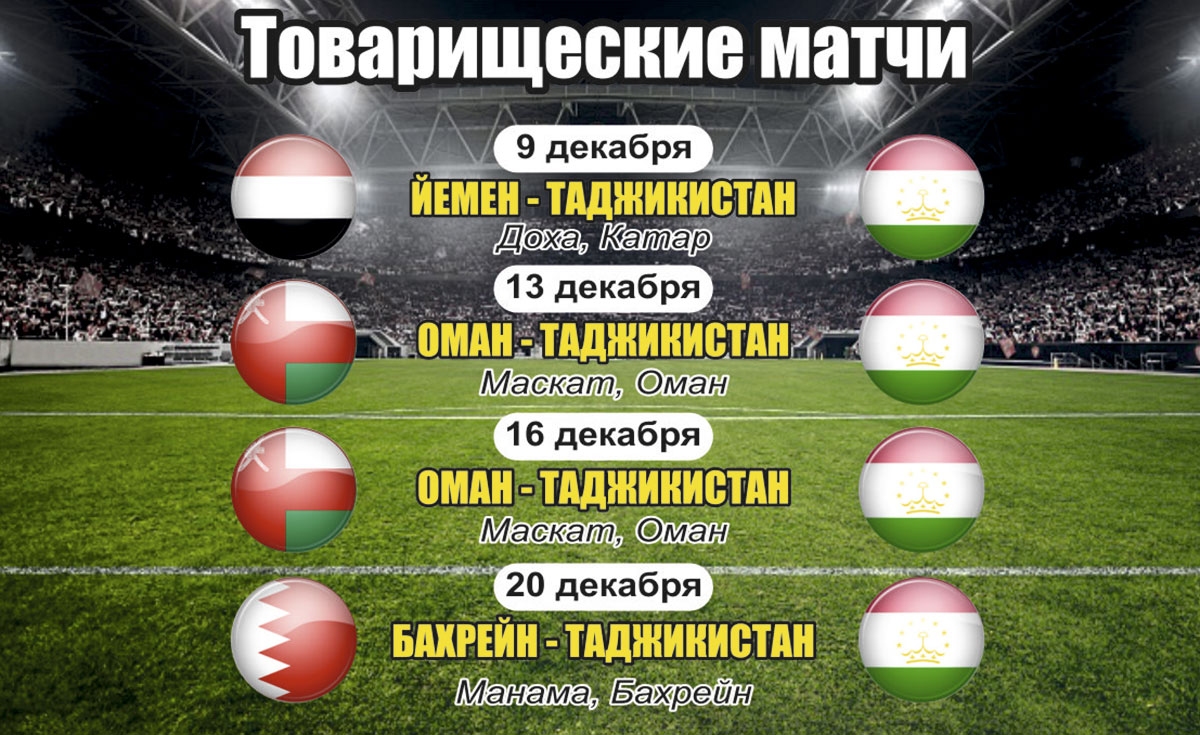 Гуфта мешавад, мунтахаби Тоҷикистон санаи 9 декабр дар Доҳа – бо тими Яман, рӯзҳои 13 ва 16 декабр дар Маскат – бо Уммон (ду вохӯрӣ) ва санаи 20 декабр дар Манама – бо дастаи мунтахаби Баҳрайн бозӣ мекунад.