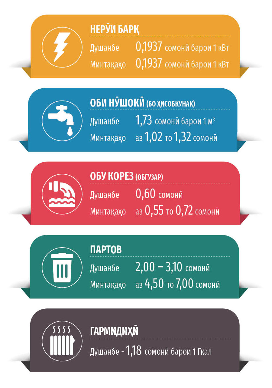 Дар робита ба чанде қабл болоравии тарифҳо ба об ва нерӯи барқ (ба гармидиҳӣ алҳол тарифҳо боло нарафтаанд, ҳарчанд дар ин бора гуфта буданд), мо тасмим гирифтем, ки ҳамаи пардохтҳои коммуналиро дар як тасвир манзуратон гардонем.