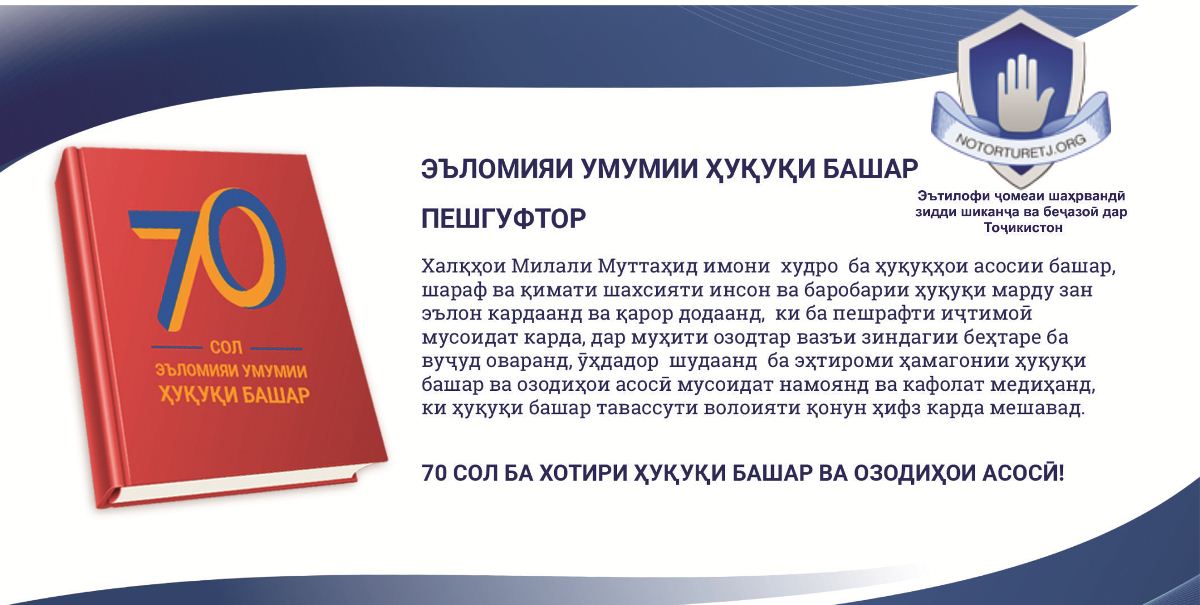 Эътилофи ҷомеаи шаҳрвандӣ зидди шиканҷа ва беҷазоӣ дар Тоҷикистон бахшида ба 70-солагии қабули Эъломияи умумии ҳуқуқи башар ва Рӯзи байналмилалии ҳифзи ҳуқуқи инсон як қатор чорабиниҳо мегузаронад.