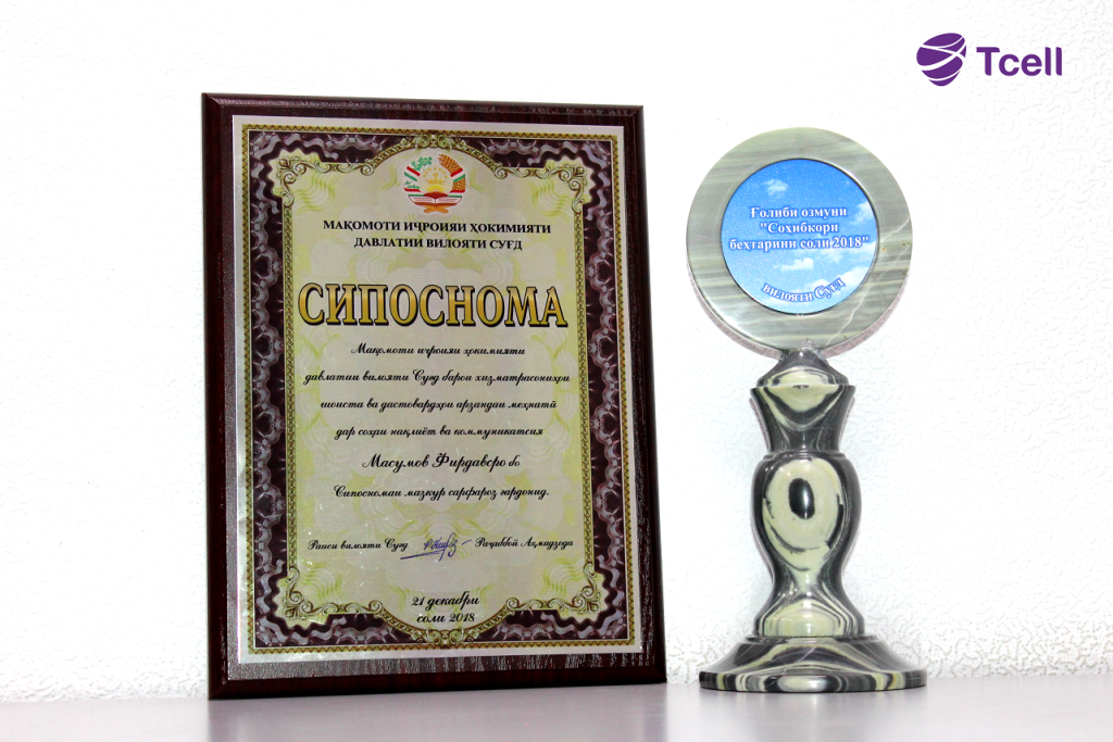 Дар шаҳри Хуҷанд маросими ҷоизасупорӣ ба ғолибони озмуни “Беҳтарин соҳибкори соли 2018”, баргузор шуд, ки бо ибтикори Раҷаббой Аҳмадзода, Раиси вилояти Суғд роҳандозӣ гардида буд. Бар асоси ҷамъбасти натиҷаҳои соли 2018, ширкати Tcell ҷоизаи ифтихории озмунро дар бахши “Беҳтарин соҳибкор дар соҳаи коммуникатсия ва нақлиёт” ба даст овардl