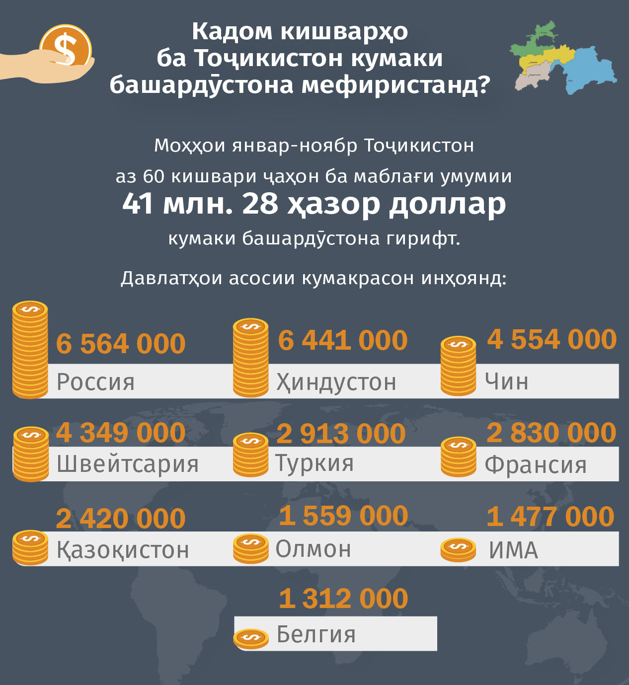 Тоҷикистон аз 60 кишвар ба маблағи 41 млн. доллар кумаки башардӯстона гирифт. Сеяки кумак аз ҳаҷми умумӣ ба Русия ва Ҳиндустон рост меояд. Кумаки Чин, ки маблағаш соли гузашта ба 23 млн. доллар баробар буд, имсол панҷ маротиба – то 4,5 млн. доллар кам шуд. Дар доираи ин кумакҳо ба Тоҷикистон аз ҳама бештар орду равған оварда шуд. Ҳаҷми кумак беш аз 22 ҳазор тоннаро ташкил медиҳад.