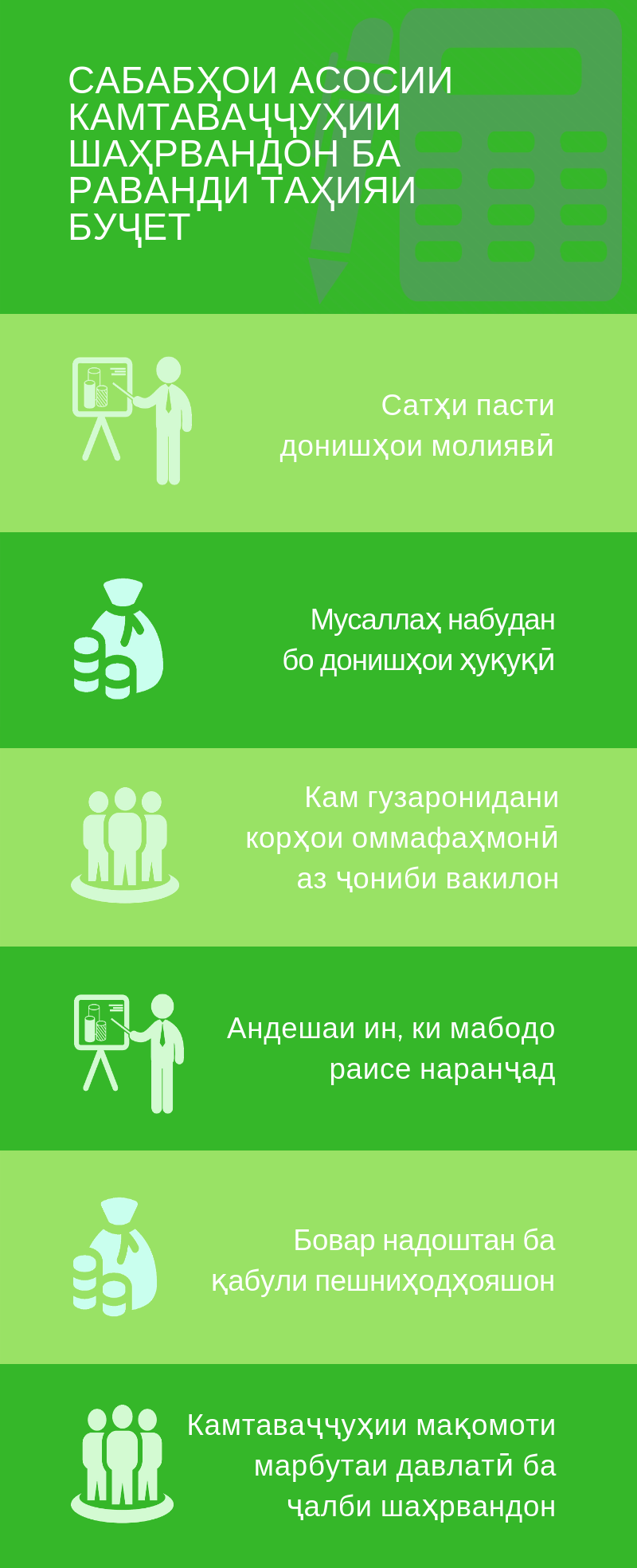 Комил набудани маърифати иқтисодию ҳуқуқии мардум, бефарқ муносибат кардан ба ҳисобукитоби расмии молиявӣ ва истиҳола аз соҳибмансабон. Ин ва чанд масъалаи дигар, ба андешаи афроди огоҳ, аз омилҳои одатшудаеанд, ки шаҳрвандони моро аз пурсидани ҷузъиёти буҷетҳои маҳаллӣ ва хоҳиши иштирок зимни таҳияи лоиҳаи онҳо бозмедоранд.