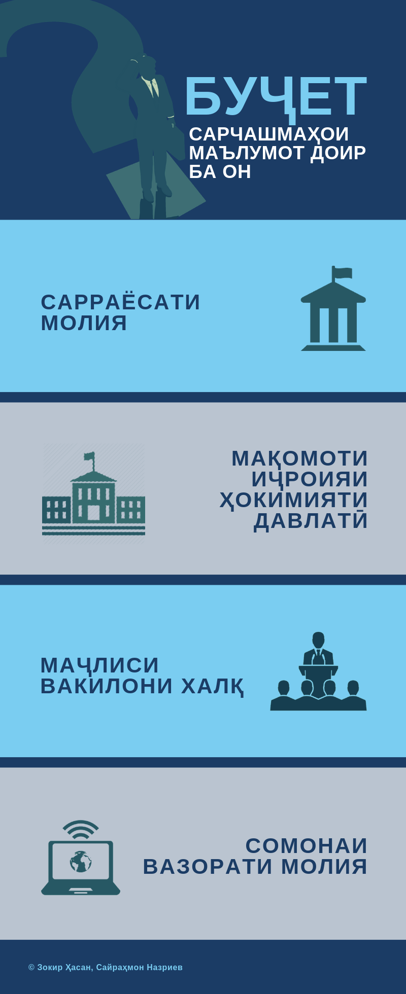 – Ин хуб аст, агар мардум донистан хоҳанд, ки пули андозҳои месупурдаашон оё барои беҳсозии зиндагияшон масраф мешавад ё хайр, – мегӯяд Умед Абдуназарзода, муовини сардори Раёсати молияи шаҳри Бохтар. – Вале азбаски донишҳои ҳуқуқию иқтисодии шаҳрвандон дар сатҳи паст қарор доранд, онҳо ба масоили марбут ба буҷет ҳеҷ таваҷҷуҳ надоранд.