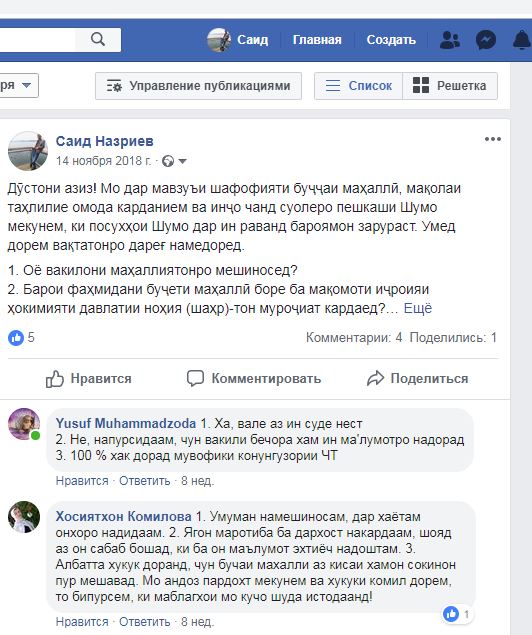 “Пас аз он, ки мо муҳтавои ҳама санадҳои тозақабулро ба мардум мерасонем, онҳо дар навбати худ баъзе таклифот ироа мекунанд. Масалан, мегӯянд, ки дар самти ободонии маҳал маблағи бештар ҷудо шавад”.