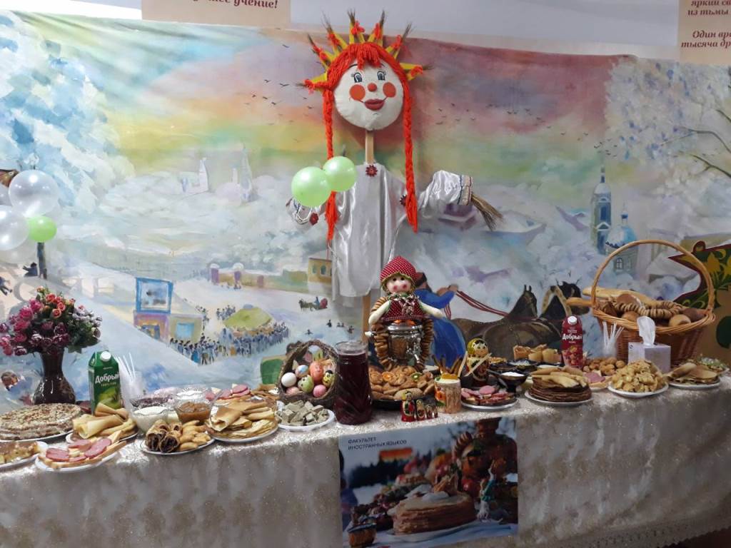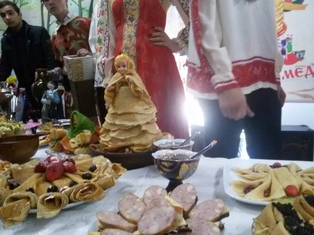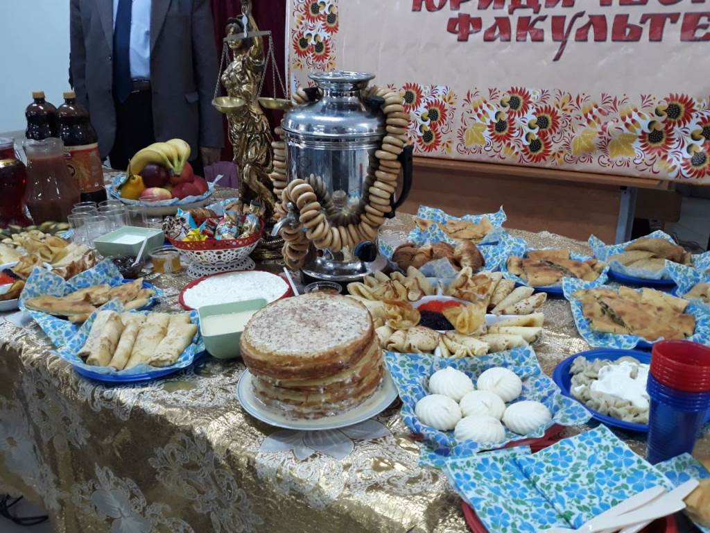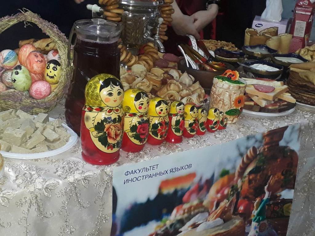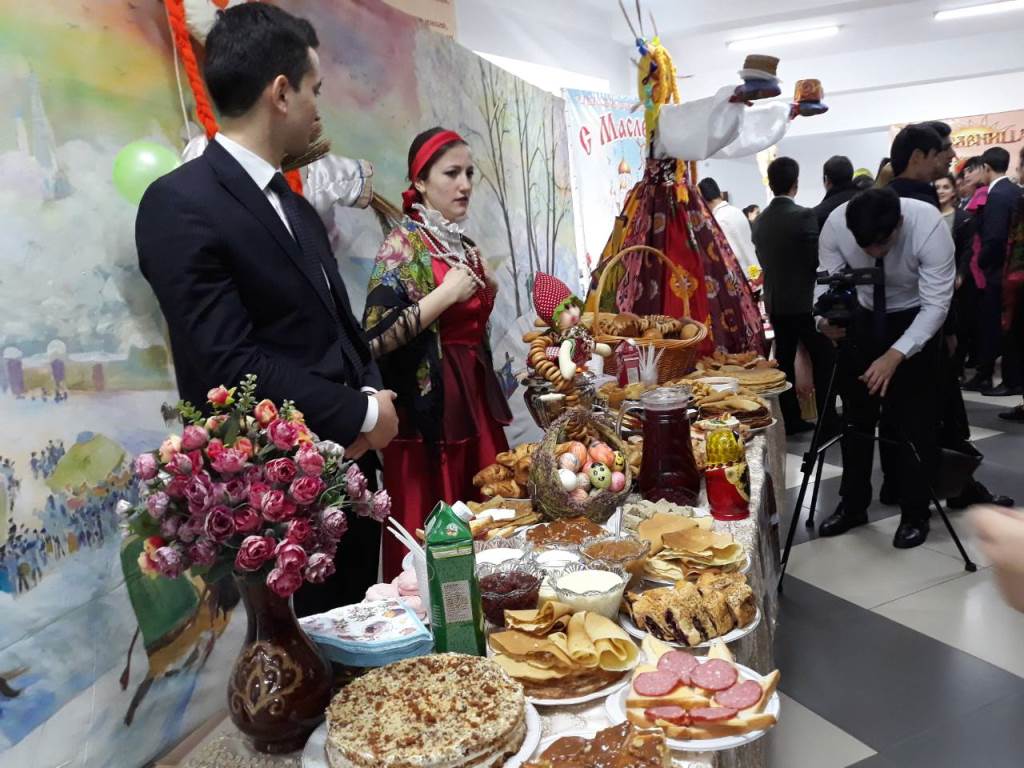 Ҳар кадоме аз факултаҳо мизи алоҳида ороста, дар онҳо ғизои асосии ин ид – чалпак (блини) мақоми хосса дошт. Ҳамчунин ба ин муносибат аз ҷониби донишҷӯён барномаи идона намоиш дода шуд.