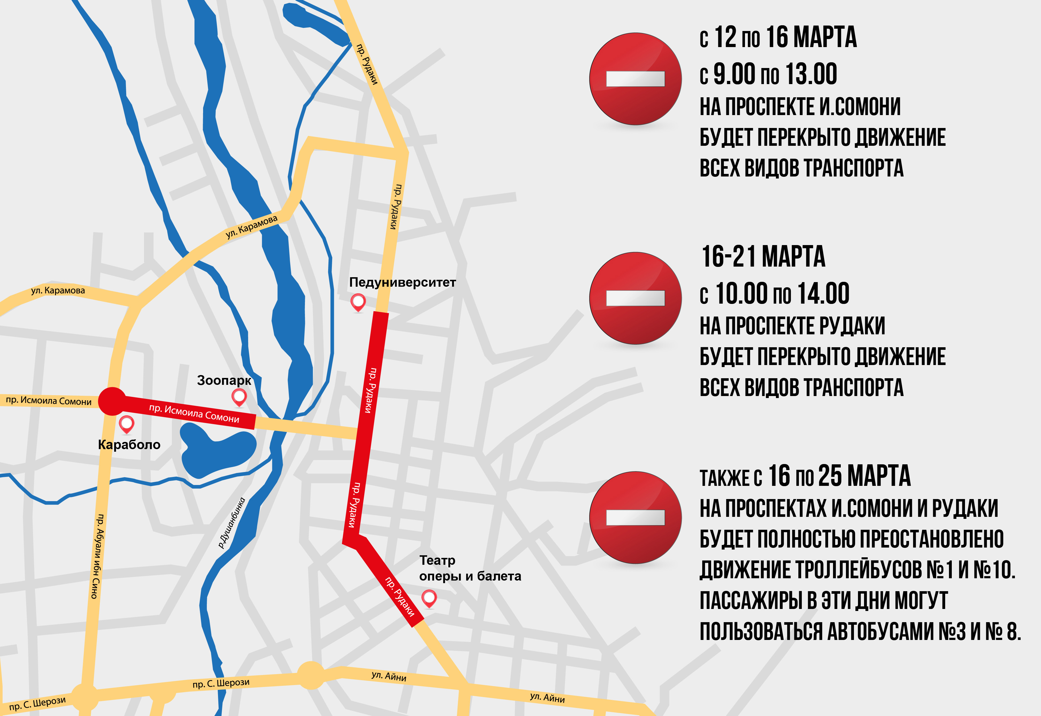 Аз 16 то 21 март аз соати 10:00 то 14:00 воситаҳои нақлиёт тариқи хиёбони Рӯдакӣ (аз гузаргоҳи меҳмонхонаи “Тоҷикистон” то ТВ “Сафина”) гузашта наметавонанд.