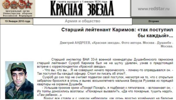 Сӯҳроб Каримов, хатмкардаи Донишгоҳи ҳарбии Москва, ҳанӯз замони кораш дар Тоҷикистон ном баровард. “Красная звезда” – нашрияи Вазорати дифои Русия – соли 2010 навишт, ки Сӯҳроб Каримов кӯдаки 8-солаи тоҷик Беҳрӯз Рӯзиевро аз сӯхтор дар Душанбе наҷот дод. Худи ӯ ба ин нашрия гуфта буд, ки “ҳеч қаҳрамонӣ накардааст ва ҳар афсар бояд чунин рафтор кунад”.
